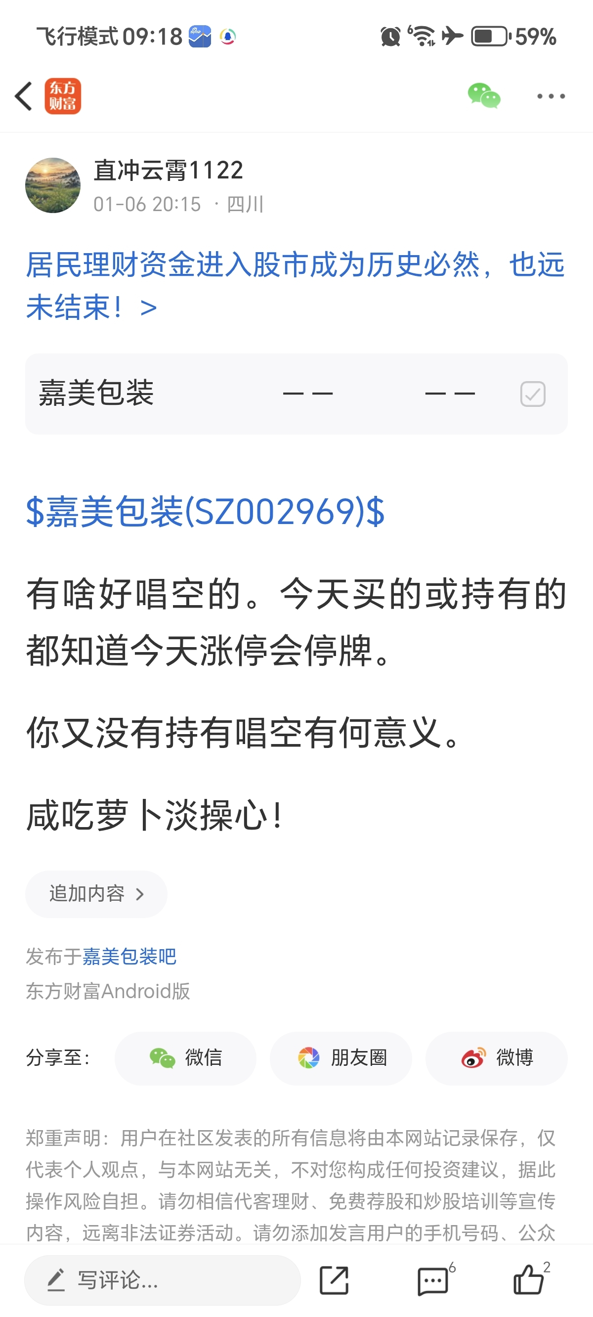 温馨提示: 1.根据《证券法》规定,禁止编造、传播虚假信息或者误导性信息,扰乱证券市场;2.用户在本社区发表的所有资料、言论等仅代表个人观点,与本网站立场无关,不对您构成任何投资建议。用户应基于自己的独立判断,自行决定证券投资并承担相应风险。《东方财富社区管理规定》