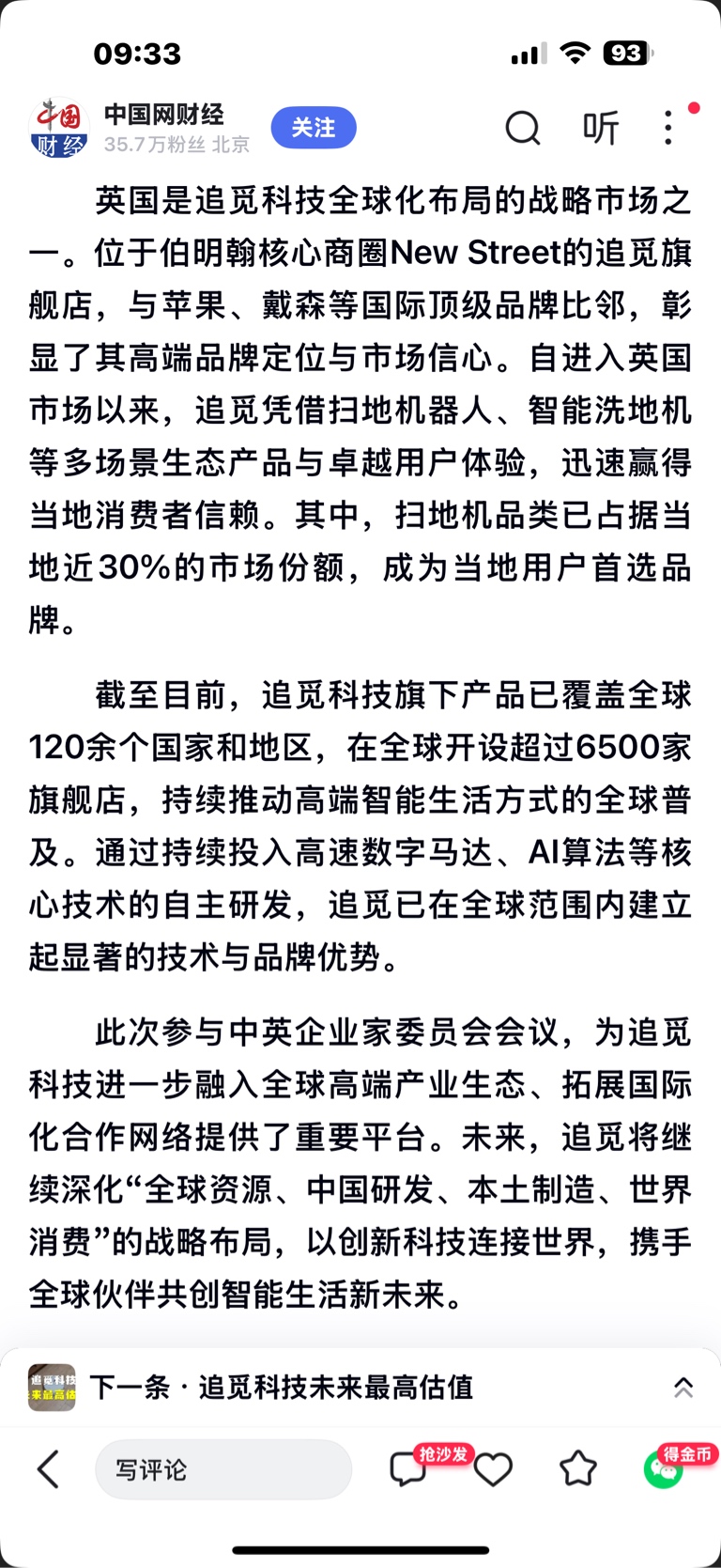 50家出席中英商业大会,只提三家,京东小米追觅科技,追觅做高端机器人全球制造,小