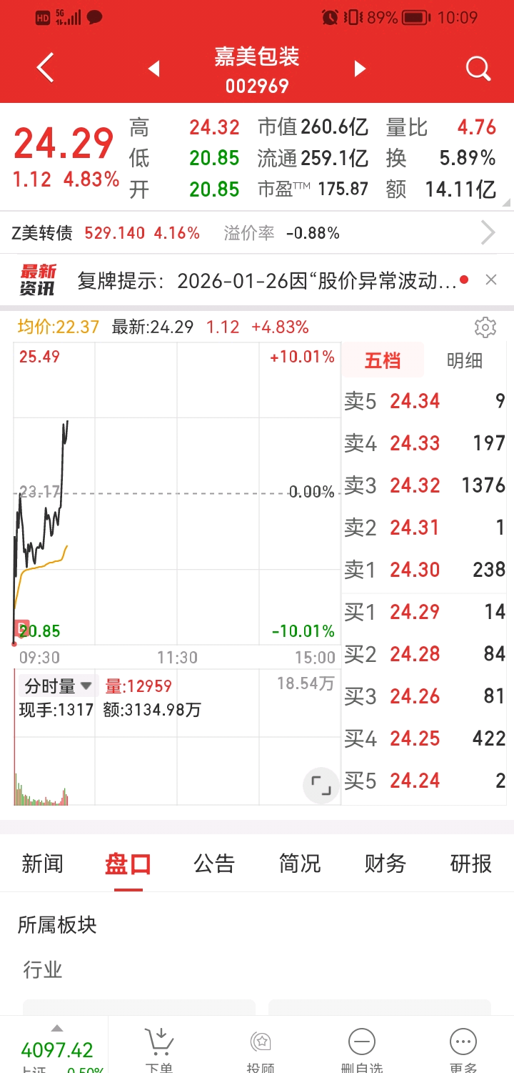 $嘉美包装(SZ002969)$ $锋龙股份(SZ002931)$ 竞价确定两支妖股都会开板,但是嘉美的成交单大于封单,锋龙的成交单小于封单,最后确定嘉美先炸板!