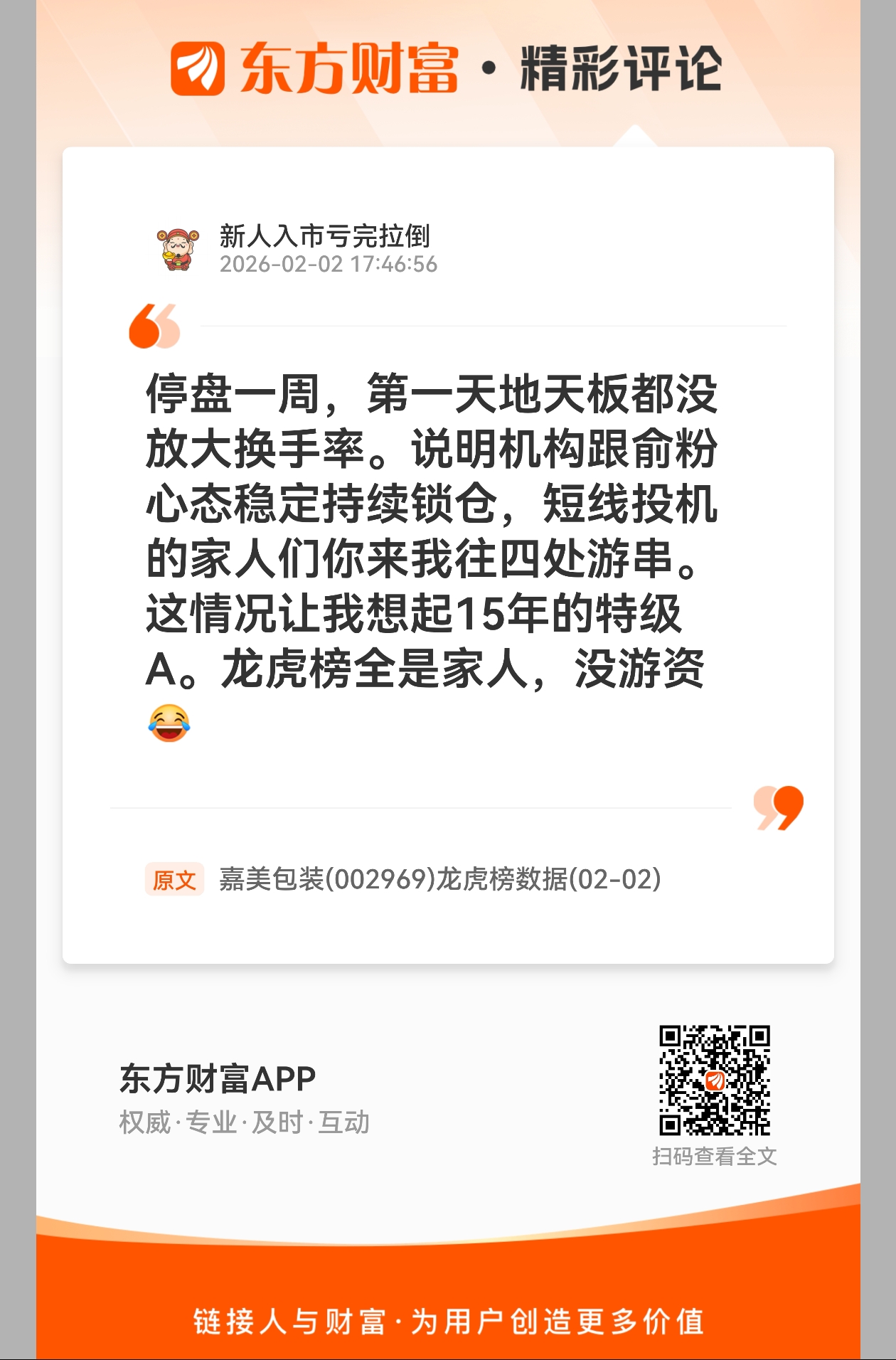 温馨提示: 1.根据《证券法》规定,禁止编造、传播虚假信息或者误导性信息,扰乱证券市场;2.用户在本社区发表的所有资料、言论等仅代表个人观点,与本网站立场无关,不对您构成任何投资建议。用户应基于自己的独立判断,自行决定证券投资并承担相应风险。《东方财富社区管理规定》