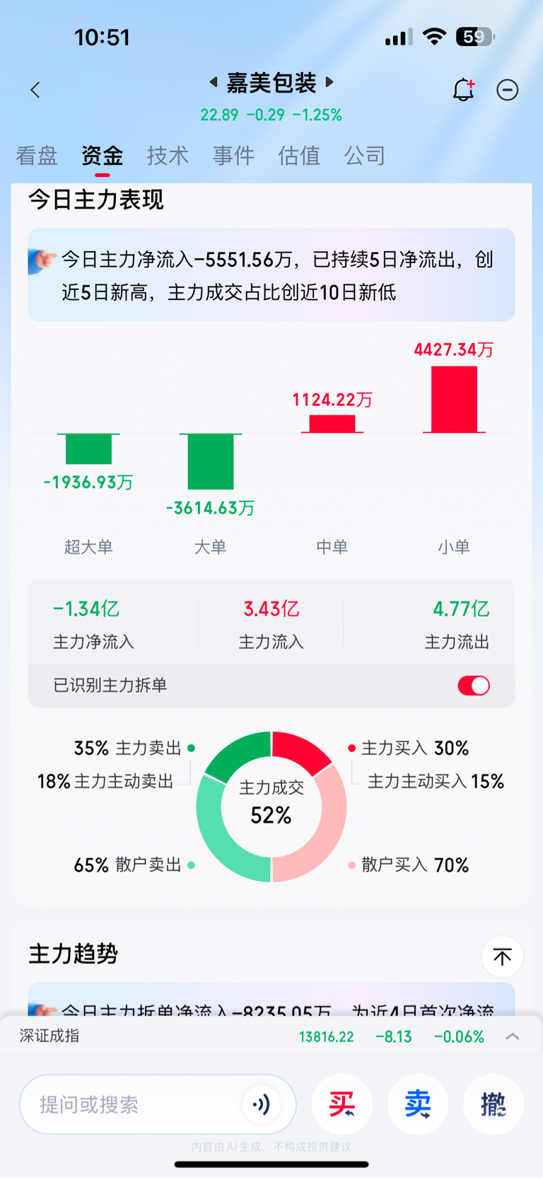 $嘉美包装(SZ002969)$ 主力目前跑了一个多亿,散户在接盘!