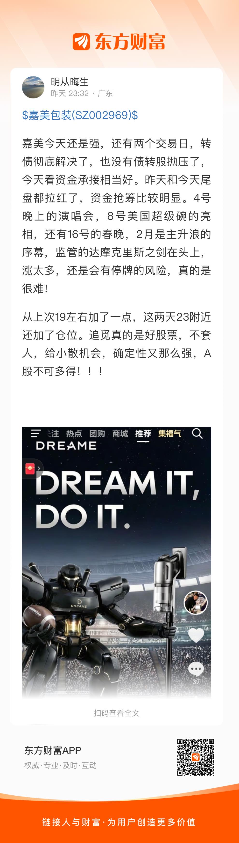 嘉美今天还是强,还有两个交易日,转债彻底解决了,也没有债转股抛压了,今天看资金承接相当好。昨天和今天尾盘都拉红了,资金抢筹比较明显。4号晚上的演唱会,8号美国超级碗的亮相,还有16号的春晚,2月是主升浪的序幕,监管的达摩克里斯之剑在头上,涨太多,还是会有停牌的风险,真的是很难!