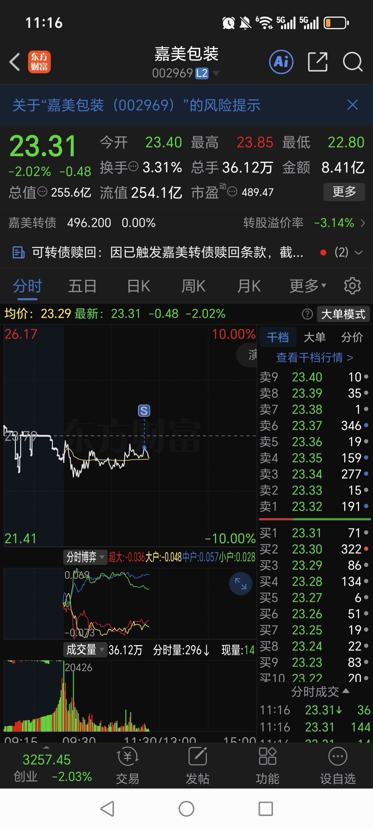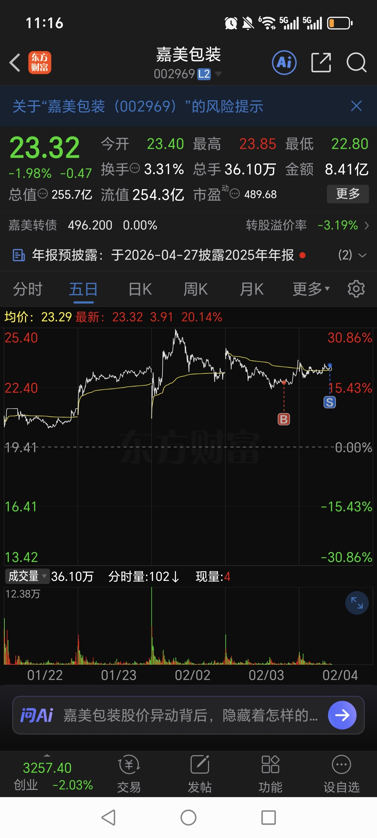 昨天锋龙VS嘉美,尾盘二选一,22.66买了嘉美包装,今天23.55已卖,锋龙都快涨停了,这个还压盘出货,赚3.8%走人,不跟它磨叽,祝留下的发财