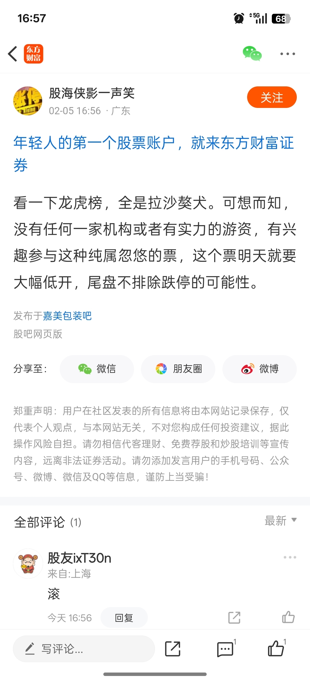 温馨提示: 1.根据《证券法》规定,禁止编造、传播虚假信息或者误导性信息,扰乱证券市场;2.用户在本社区发表的所有资料、言论等仅代表个人观点,与本网站立场无关,不对您构成任何投资建议。用户应基于自己的独立判断,自行决定证券投资并承担相应风险。《东方财富社区管理规定》