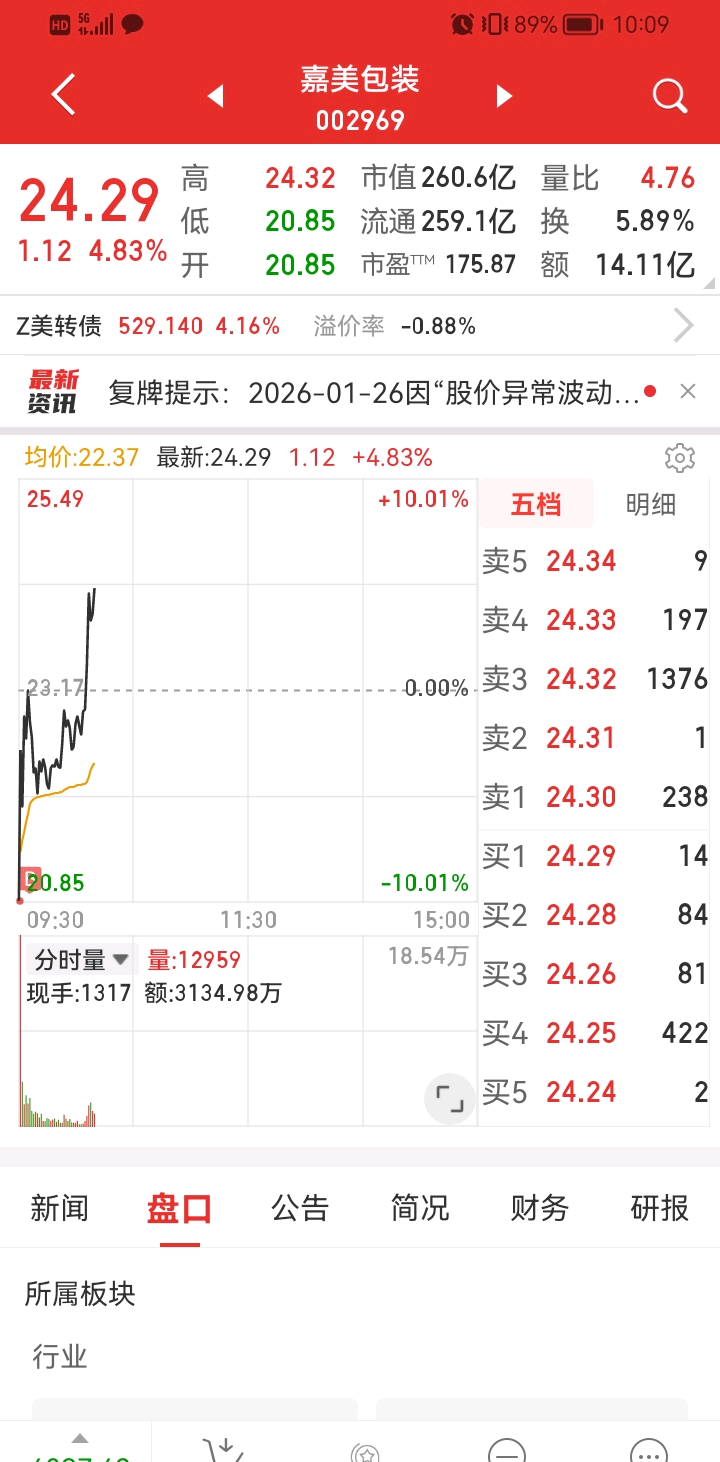 $嘉美包装(SZ002969)$ 今天还真不错,锋龙终于回调,你终于抢回龙头补涨