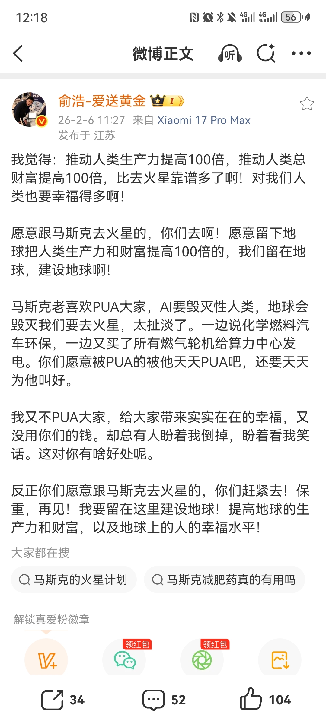 支持宇宙俞总加油,地球都还没玩明白,去火星种田?