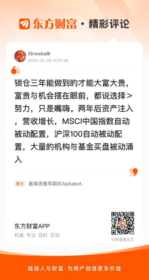//@iSnowballr : 锁仓三年能做到的才能大富大贵,富贵与机会摆在眼前,都说选择>努力,只是嘴嗨。两年后资产注入 ,营收增长,MSCI中国指数自动被动配置,沪深100自动被动配置,大量的机构与基金买盘被动涌入