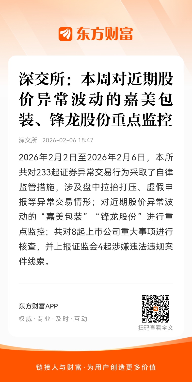 2026年2月2日至2026年2月6日,本所共对233起证券异常交易行为采取了自律监管措施,涉及盘中拉抬打压、虚假申报等异常交易情形;对近期股价异常波动的“嘉美包装”“锋龙股份”进行重点监控;共对8起上市公司重大事项进行核查,并上报证监会4起涉嫌违法违规案件线索。