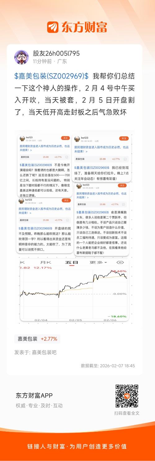 $嘉美包装(SZ002969)$ 我帮你们总结一下这个神人的操作,2 月 4 号中午买入开吹,当天被套,2 月 5 日开盘割了,当天低开高走封板之后气急败坏