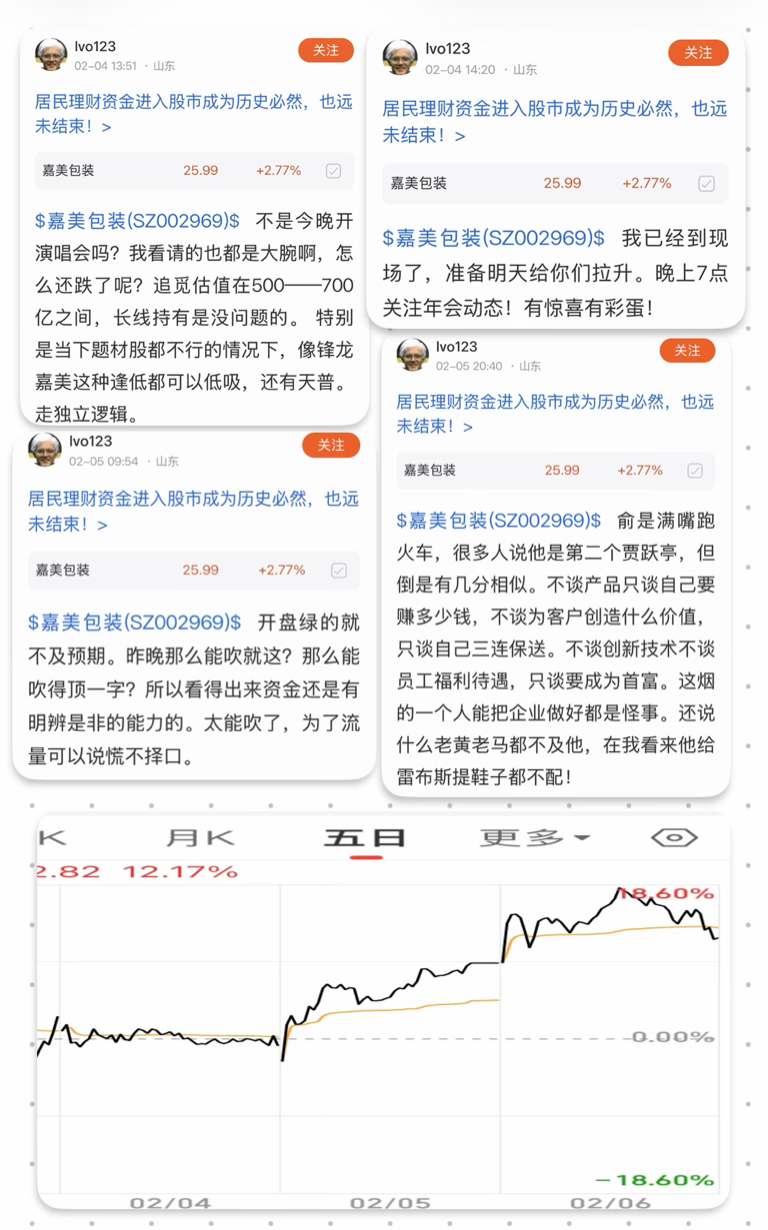 我帮你们总结一下这个神人的操作,2 月 4 号中午买入开吹,当天被套,2 月 5 日开盘割了,当天低开高走封板之后气急败坏$嘉美包装(SZ002969)$