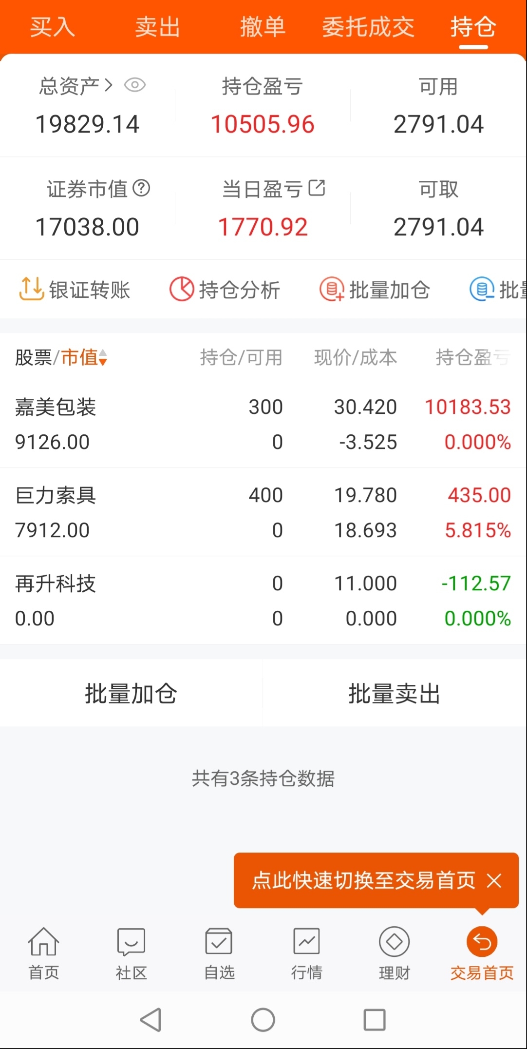 谢谢嘉美包装主力,谢谢中国天才发明家俞浩,让我的炒股成本降至负3元伍角,以后长期