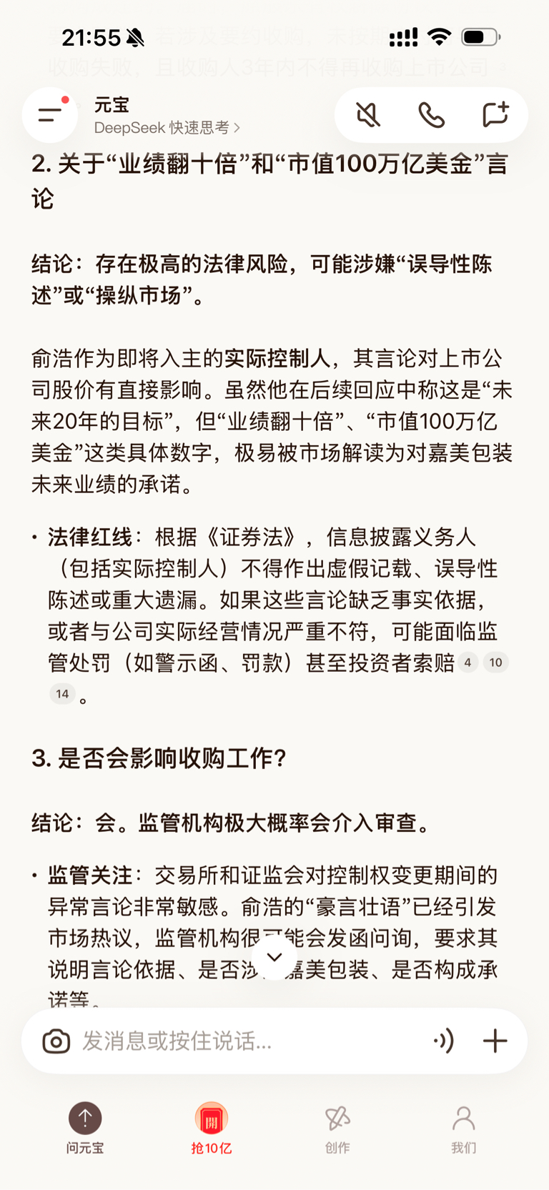 $嘉美包装(SZ002969)$ 法律红线:根据《证券法》,信息披露义务人(包括实际控制人)不得作出虚假记载、误导性陈述或重大遗漏。如果这些言论缺乏事实依据,或者与公司实际经营情况严重不符,可能面临监管处罚(如警示函、罚款)甚至投资者索赔⁴