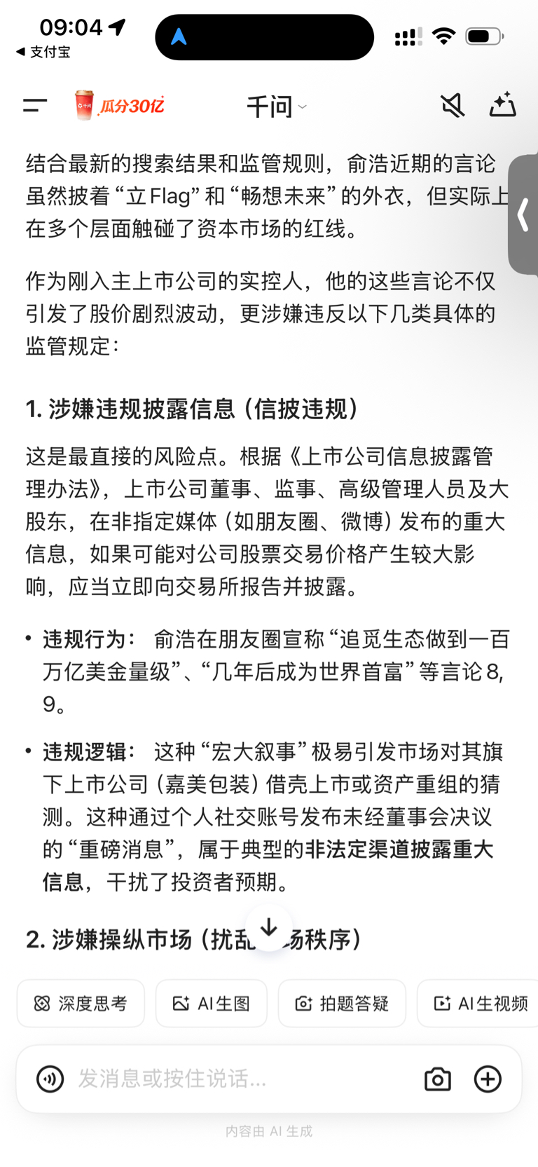 $嘉美包装(SZ002969)$ 法律红线:根据《证券法》,信息披露义务人(包括实际控制人)不得作出虚假记载、误导性陈述或重大遗漏。如果这些言论缺乏事实依据,或者与公司实际经营情况严重不符,可能面临监管处罚(如警示函、罚款)甚至投资者索赔⁴