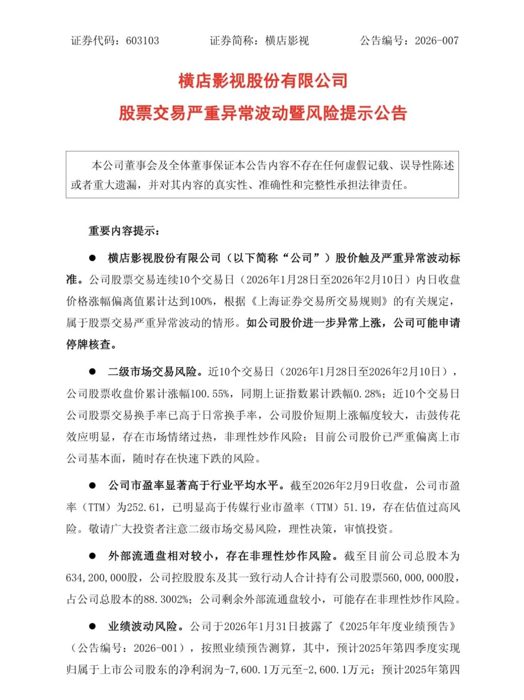 同日,横店影视(603103)公告称,公司股价触及严重异常波动标准。公司股票交易连续10个交易日(2026年1月28日至2026年2月10日)内日收盘价格涨幅偏离值累计达到100%,根据《上海证券交易所交易规则》的有关规定,属于股票交易严重异常波动的情形。如公司股价进一步异常上涨,公司可能申请停牌核查。公司股价短期上涨幅度较大,击鼓传花效应明显,存在市场情绪过热、非理性炒作风险;目前公司股价已严重偏离上市公司基本面,随时存在快速下跌的风险。敬请广大投资者注意二级市场交易风险,理性决策,审慎投资。