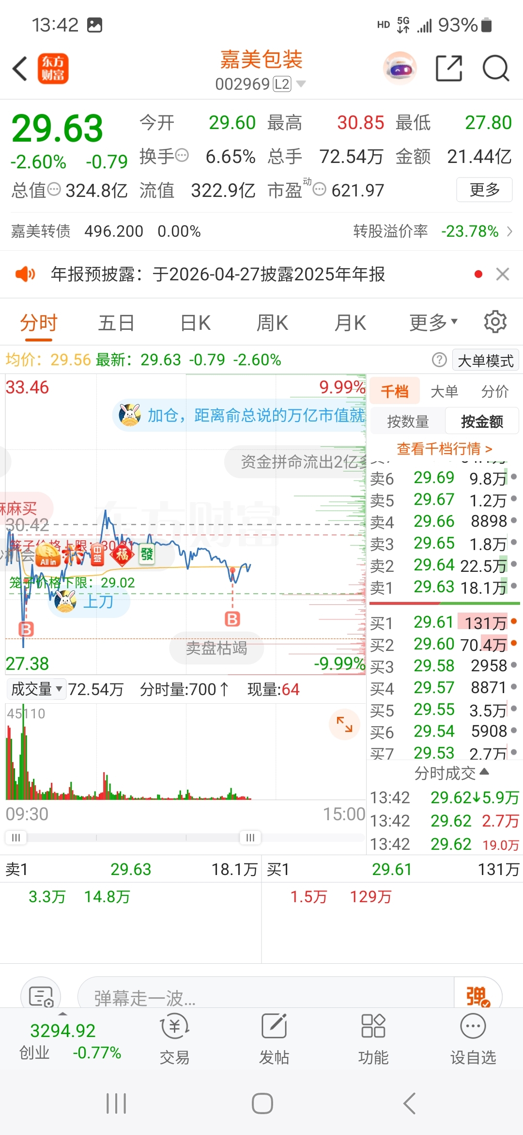 $嘉美包装(SZ002969)$ 结束价格水下1个点都算完成任务,预测大概率持平或高于开盘价。
