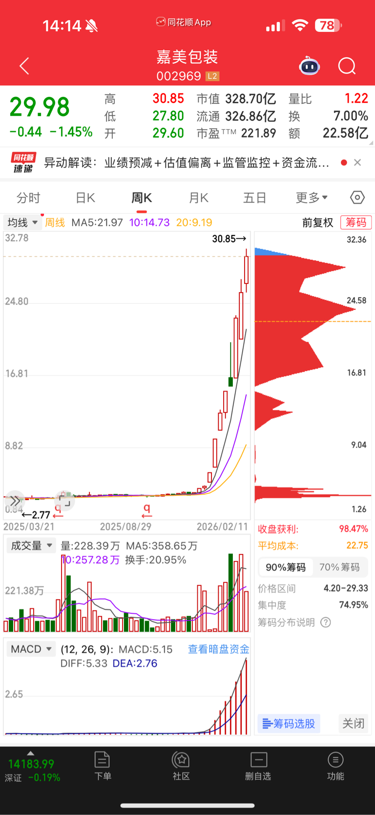 $嘉美包装(SZ002969)$ 为什么底部筹码没动,因为一家公司的股票,会有长期庄家和短期庄家。长期庄家没这么简单出货,他们会有维护市值预期,管理的工作,因为嘉美包装市值还没有到主力预期,所以他们不会出货,我估计主力出货价格应该在股价200块左右。