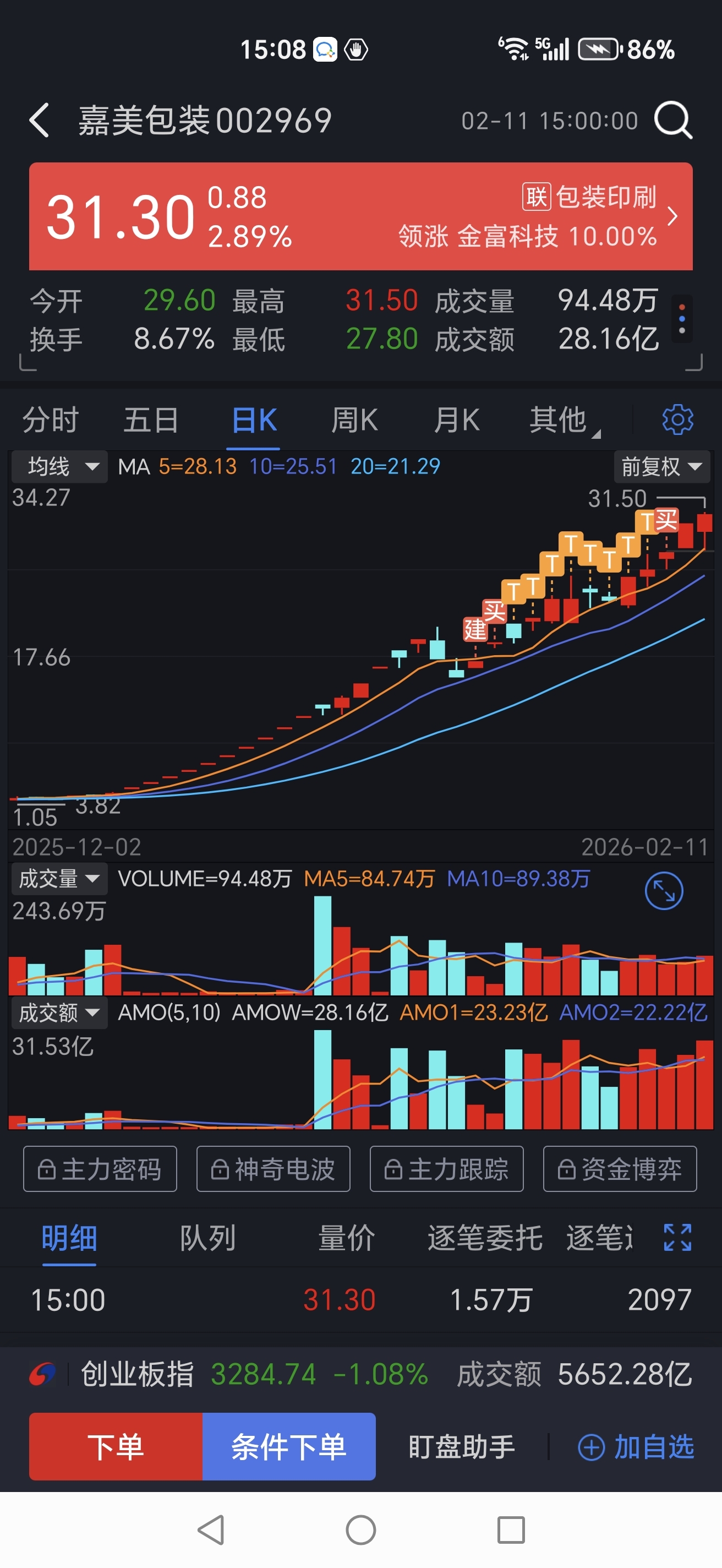 $嘉美包装(SZ002969)$ 我从1月19号买入到今天,嘉美就2月4号那天是绿的。2月2号跟今天大跌成这样都能拉上来。我反正也不能动了。年后涨到50再说。。