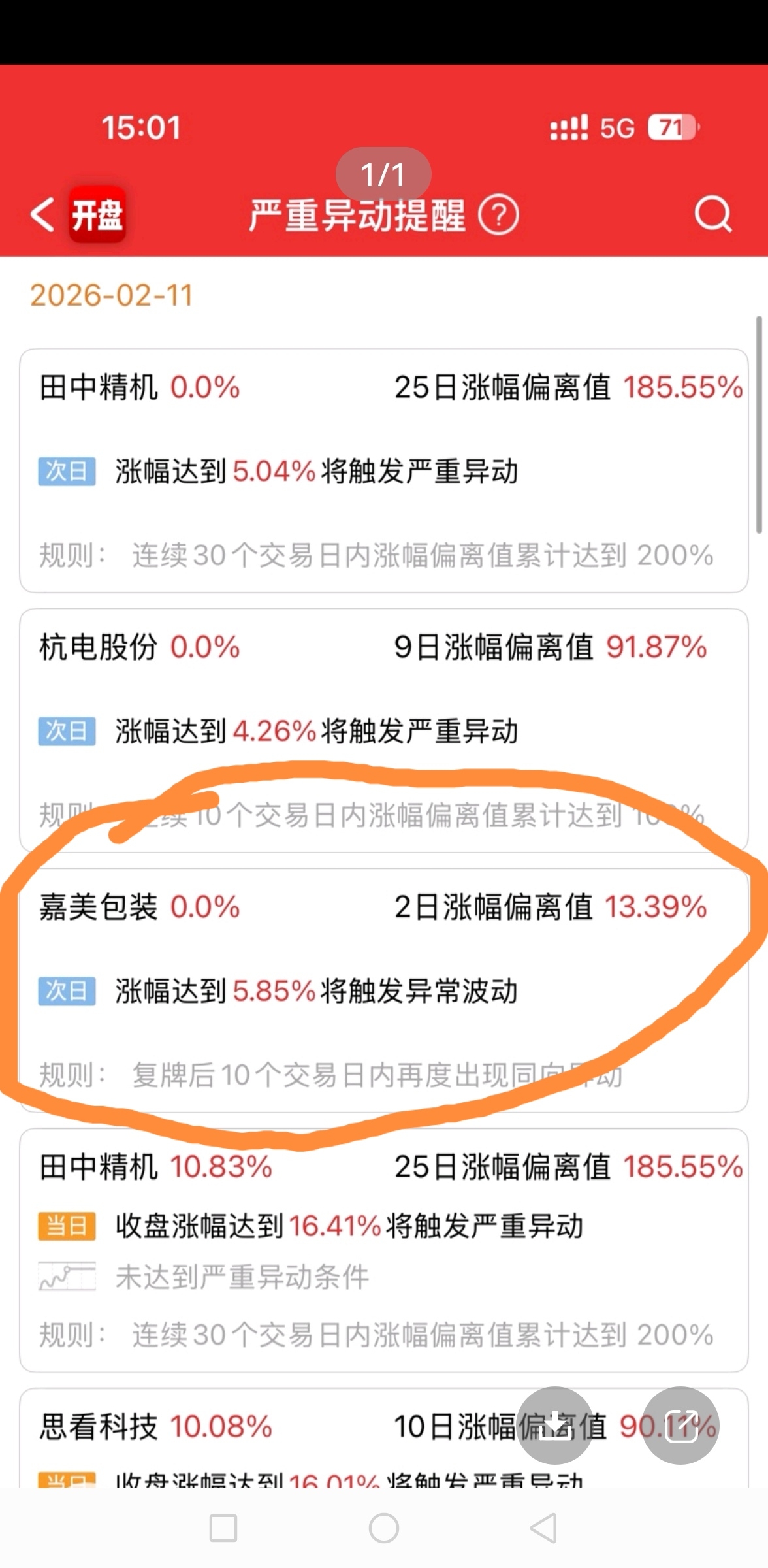 $嘉美包装(SZ002969)$  昨天偏离值是13.39%,今天不炒5.8%,就控异动的。