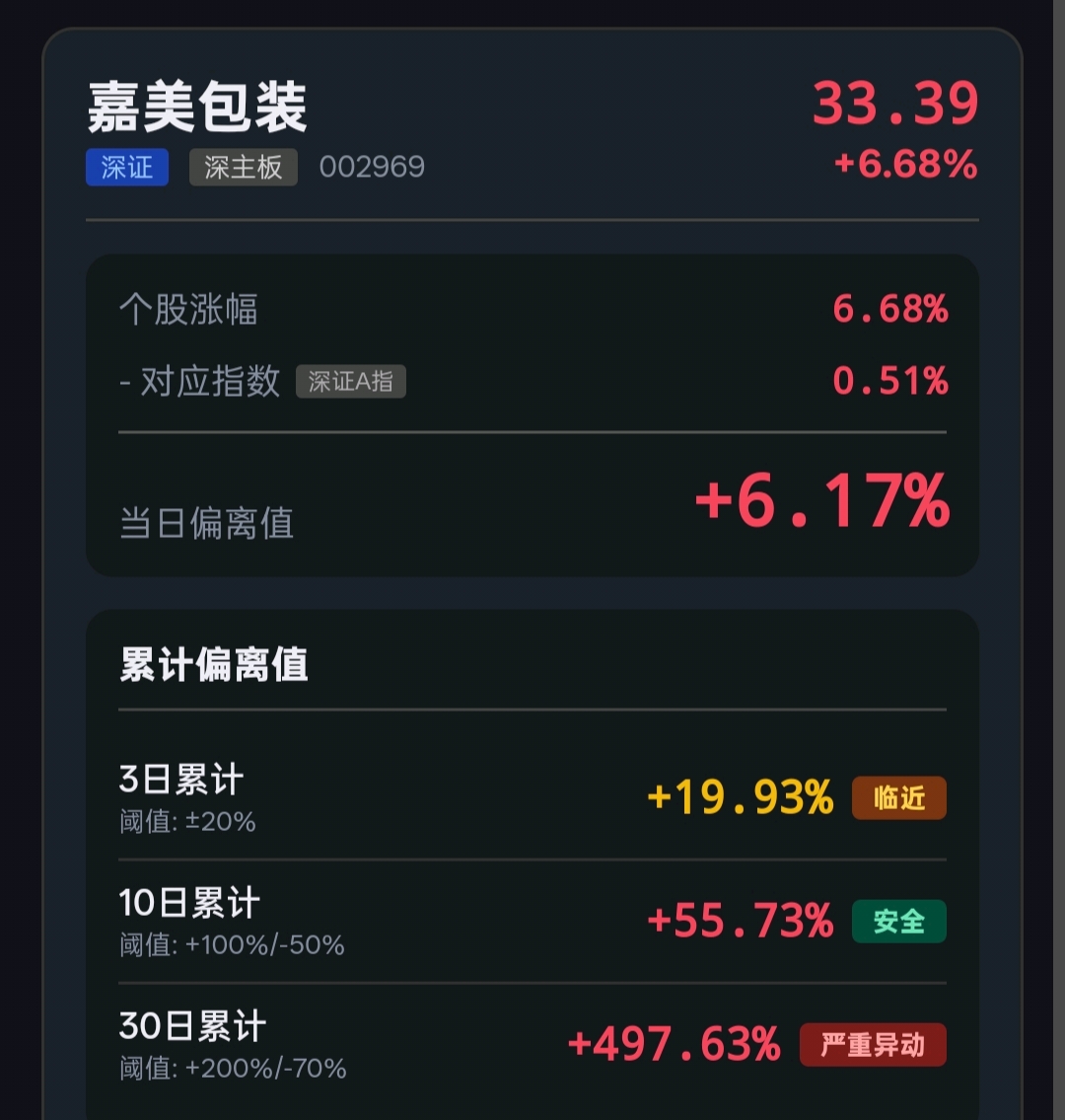 不对啊,我手动算了下,好像真超了。嘉美三日涨幅20.76%,深指三日涨幅0.52%,20.76%-0.52%=20.24%,超了0.24%