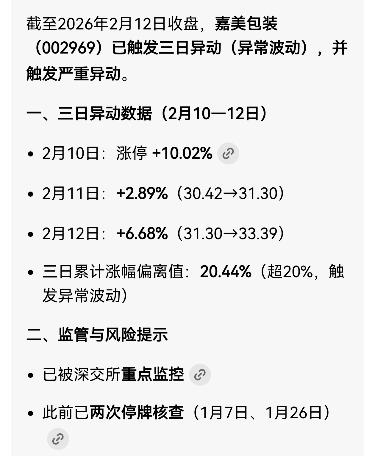 $嘉美包装(SZ002969)$ 三日超出百分20,停不停牌看晚上公告吧,这热情根本拦不住。只能说主力操盘技术太拉垮了。