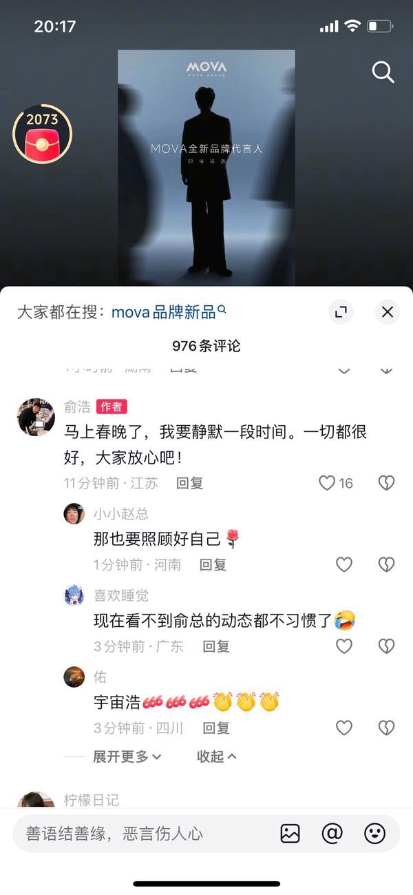 俞浩:马上春晚了,我要静默一段时间了。一切都很好,大家放心吧!