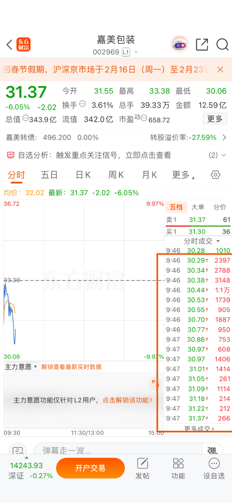 $嘉美包装(SZ002969)$ 筹码又被主力抢走了,一点一万手主买,而且出现了连续主买单子,只有没有眼光的人才会被洗!今天继续如如不动,拿铁锁仓,我认为今天依然有红盘的几率!
