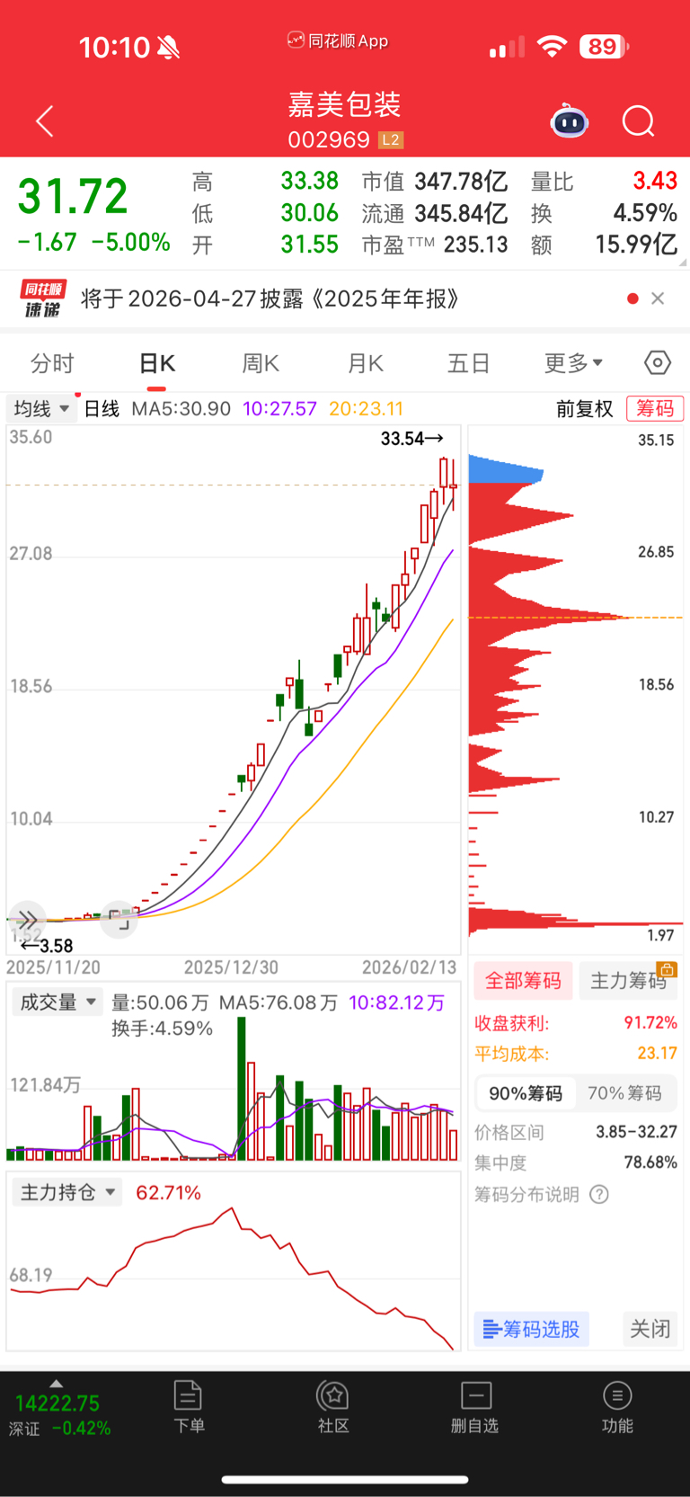 $嘉美包装(SZ002969)$ 为什么底部筹码没动,因为一家公司的股票,会有长期庄家和短期庄家。长期庄家没这么简单出货,他们会有维护市值预期,管理的工作,因为锋龙股份市值还没有到主力预期,所以他们不会出货,我估计主力出货价格应该在股价200块左右。