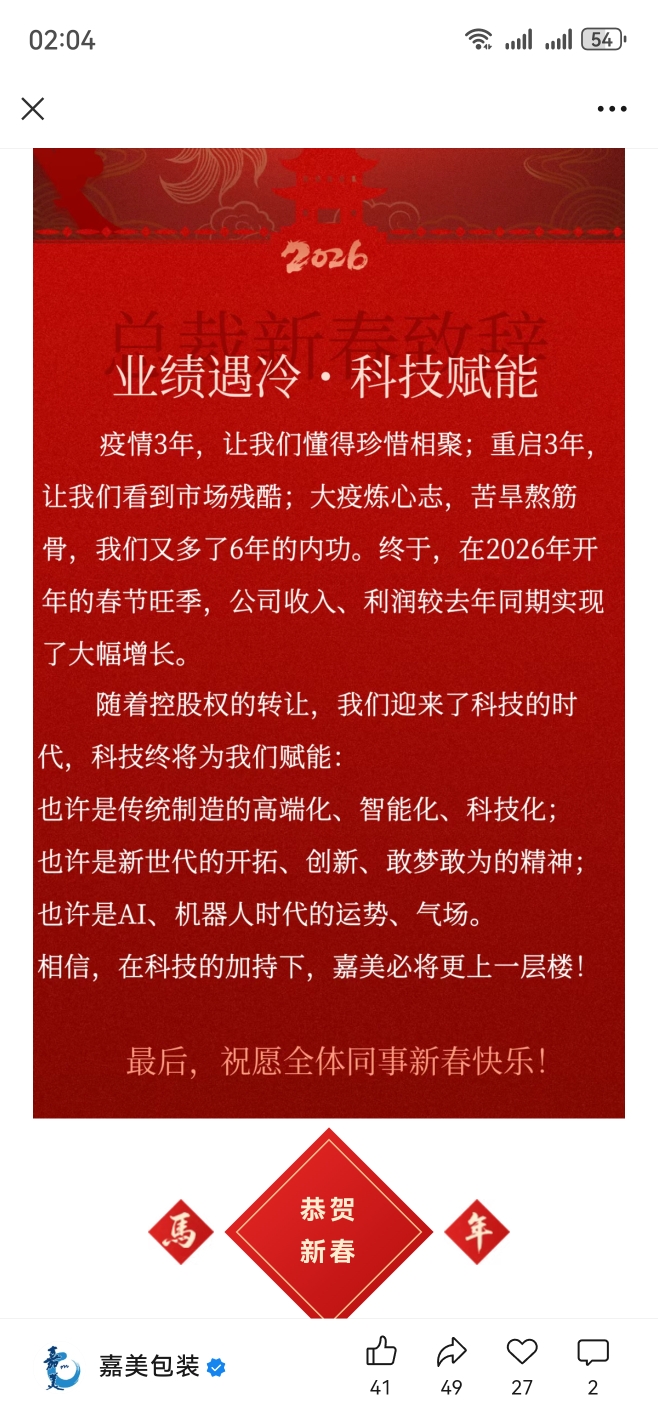 $嘉美包装(SZ002969)$ 2026注定嘉美会成为一个伟大的科技公司.加油.值得等待追觅俞总.