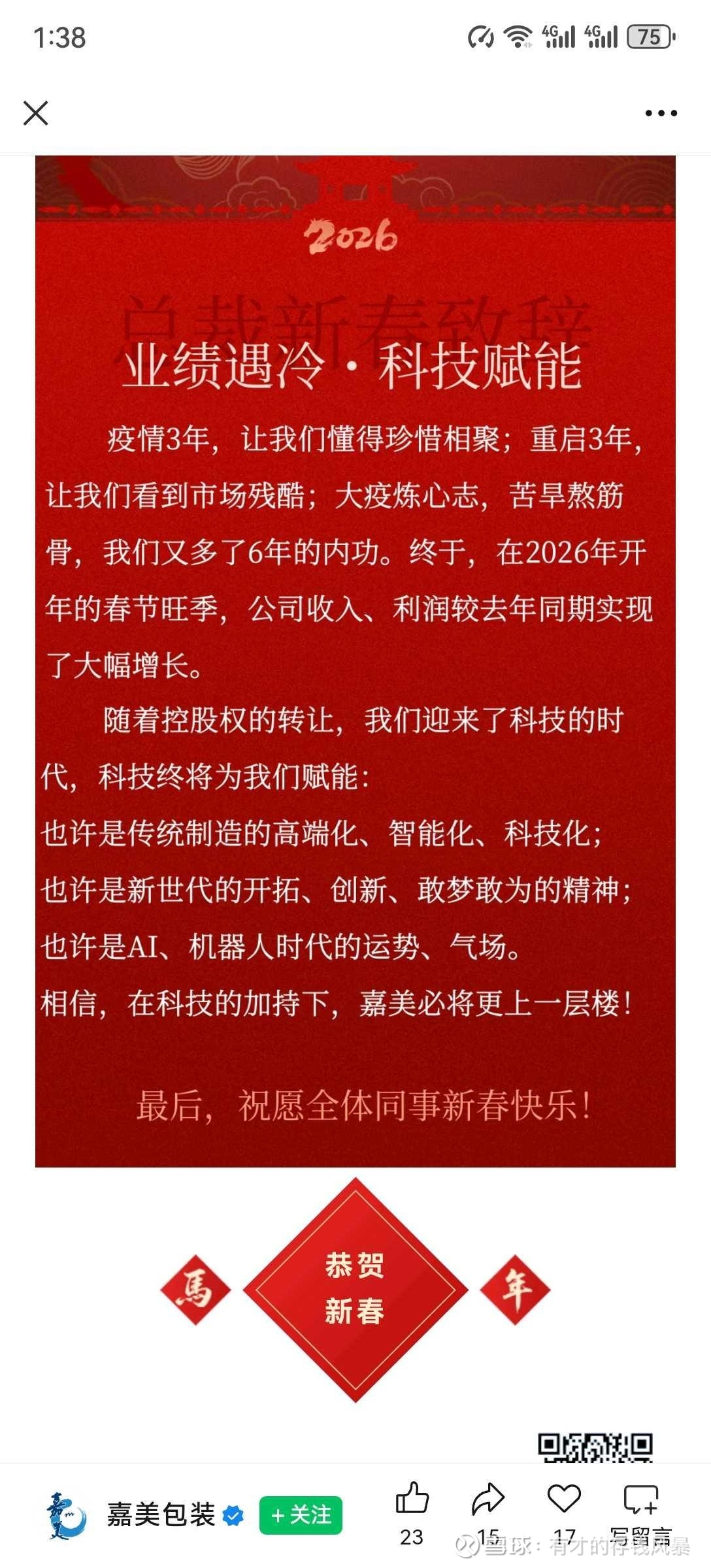 $嘉美包装(SZ002969)$ 有公司这句话,懂得都懂,不仅稳了,而且惊喜发现除了机器人还有AI,可以安心持股过节了,静待花开