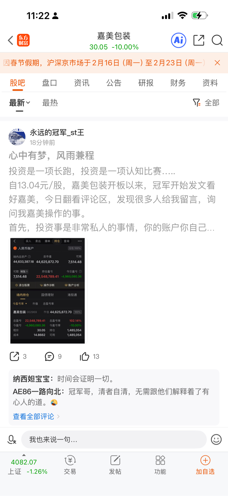 温馨提示: 1.根据《证券法》规定,禁止编造、传播虚假信息或者误导性信息,扰乱证券市场;2.用户在本社区发表的所有资料、言论等仅代表个人观点,与本网站立场无关,不对您构成任何投资建议。用户应基于自己的独立判断,自行决定证券投资并承担相应风险。《东方财富社区管理规定》