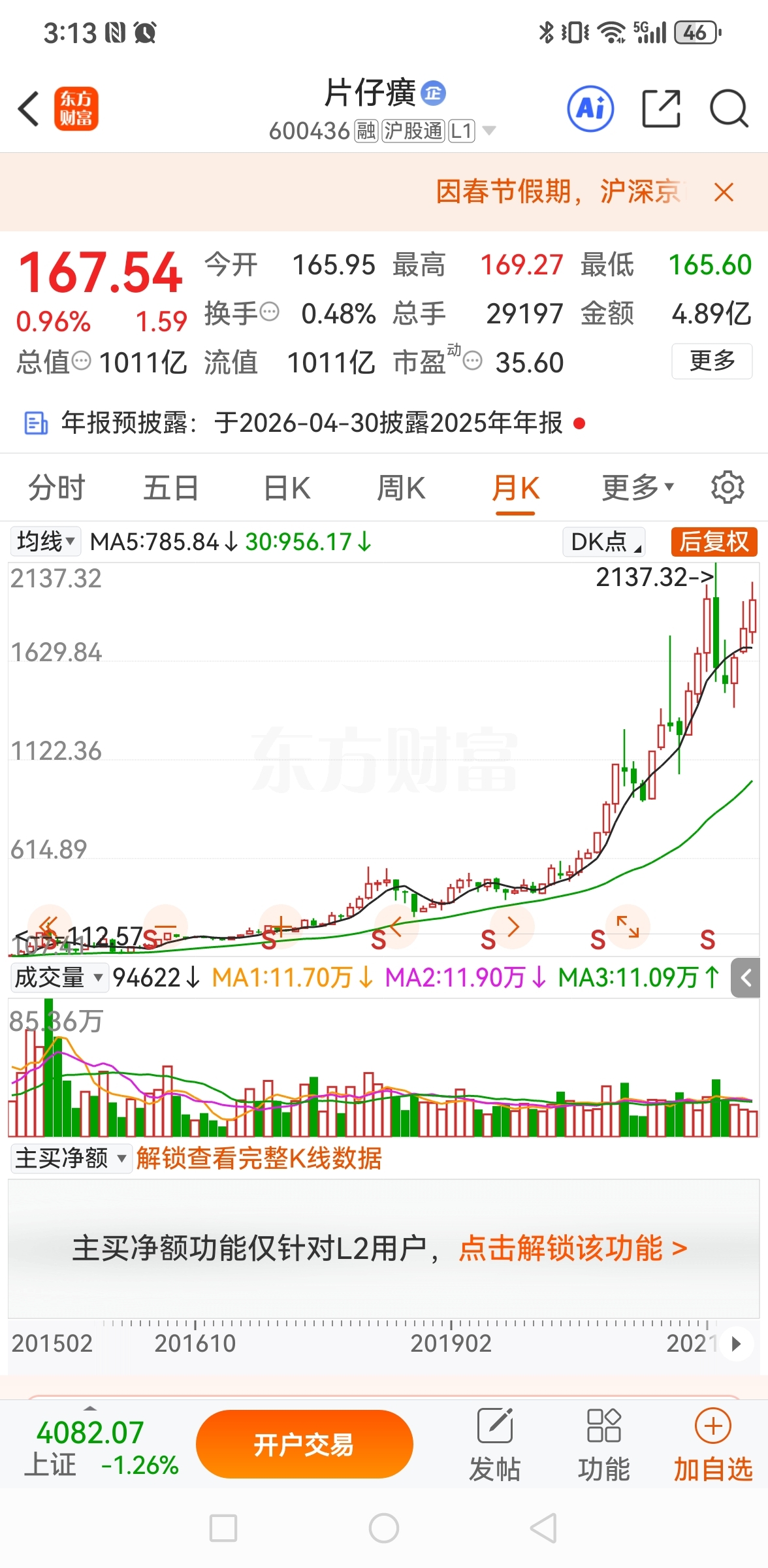 看看当年的格力电器,十多年时间,股价几十块干到1万(复权后),片仔癀11块干到2