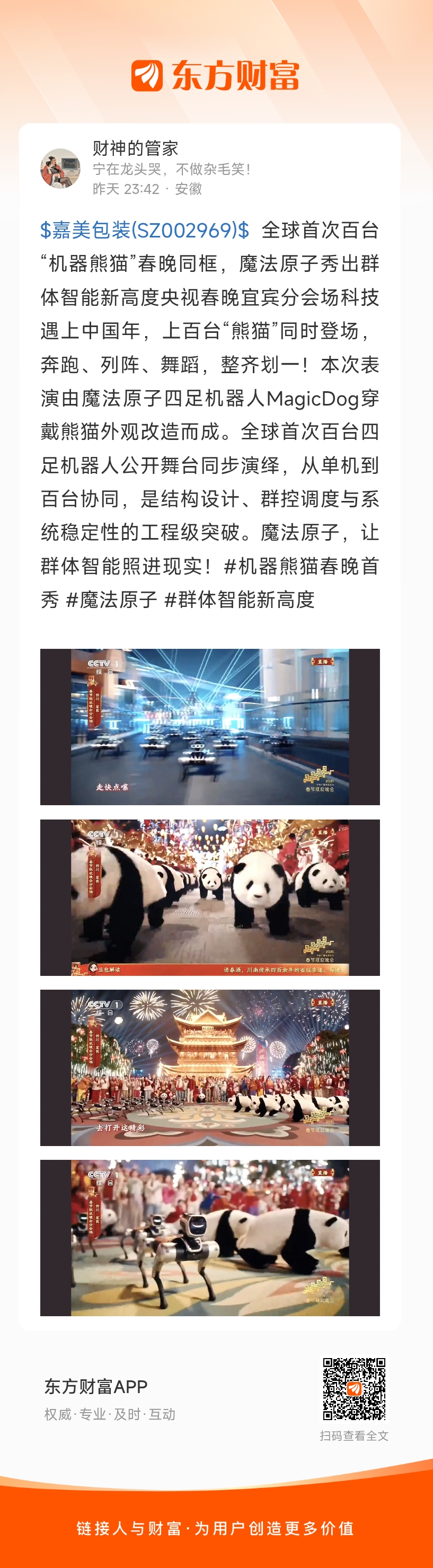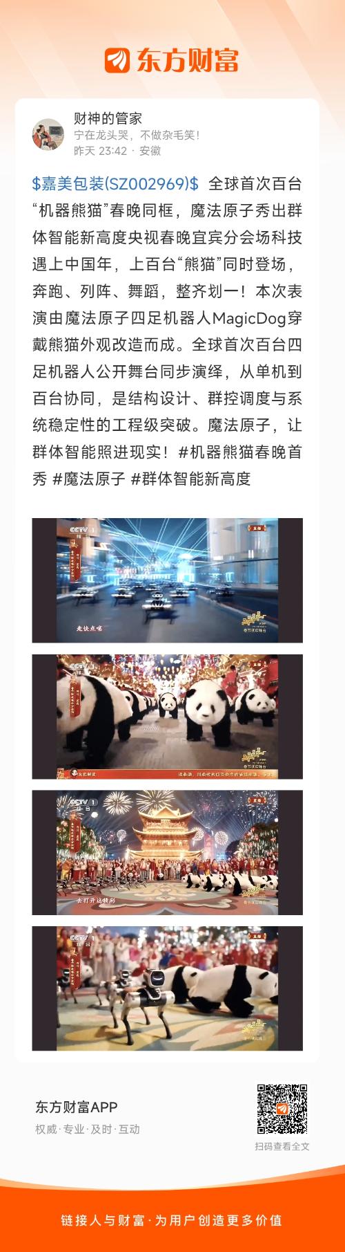$嘉美包装(SZ002969)$ 全球首次百台“机器熊猫”春晚同框,魔法原子秀出群体智能新高度央视春晚宜宾分会场科技遇上中国年,上百台“熊猫”同时登场,奔跑、列阵、舞蹈,整齐划一!本次表演由魔法原子四足机器人MagicDog穿戴熊猫外观改造而成。全球首次百台四足机器人公开舞台同步演绎,从单机到百台协同,是结构设计、群控调度与系统稳定性的工程级突破。魔法原子,让群体智能照进现实!#机器熊猫春晚首秀 #魔法原子 #群体智能新高度