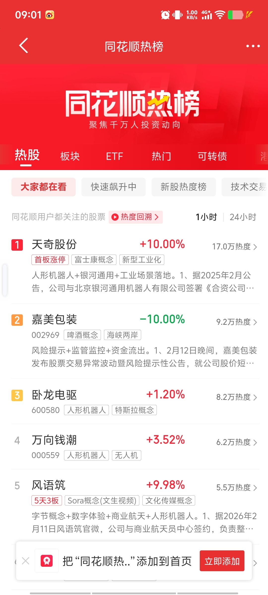 $嘉美包装(SZ002969)$ 同花顺热度榜排名第二。 直线飙升