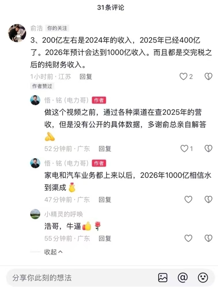 俞浩在网上吹水说:2024年收入200亿左右,2025年已经400亿了,2026年预计会达到1000亿收入,而且都是交完税之后的税财务收入。