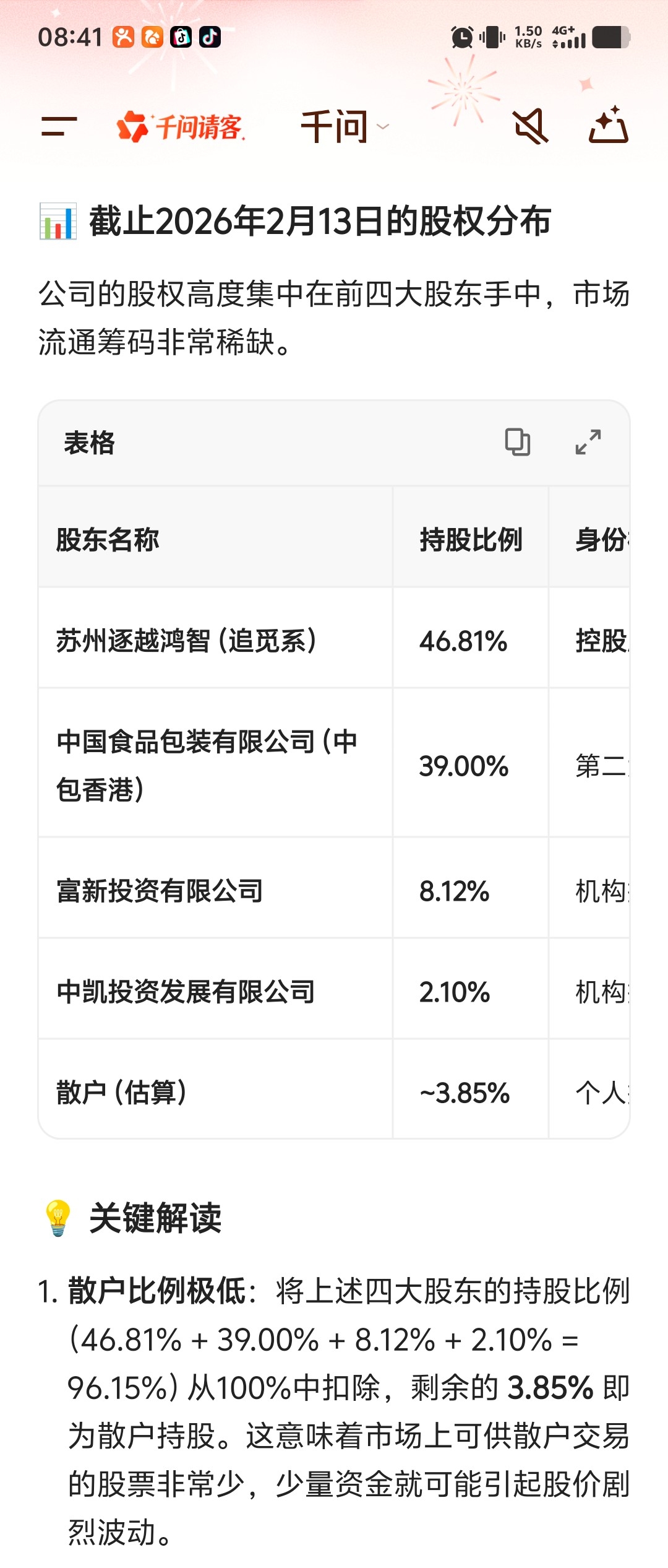 $嘉美包装(SZ002969)$ 截止2月13号公司的股权高度集中在前四大股东手中,市场流通筹码非常稀缺。