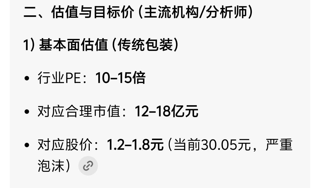 $嘉美包装(SZ002969)$ 完了完了,豆包说机构预估嘉美包装的股价才1.2-1.8元,连两块钱都不到