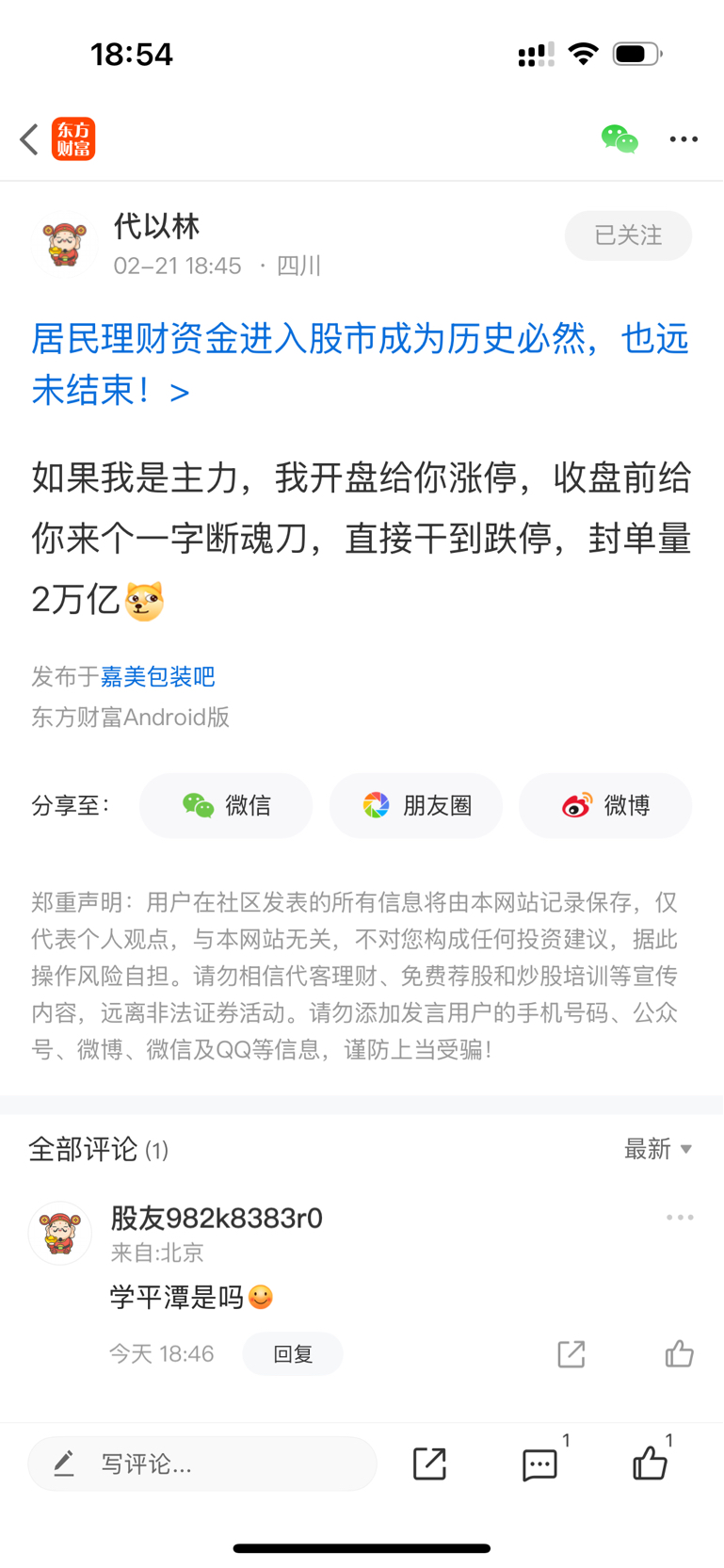温馨提示: 1.根据《证券法》规定,禁止编造、传播虚假信息或者误导性信息,扰乱证券市场;2.用户在本社区发表的所有资料、言论等仅代表个人观点,与本网站立场无关,不对您构成任何投资建议。用户应基于自己的独立判断,自行决定证券投资并承担相应风险。《东方财富社区管理规定》