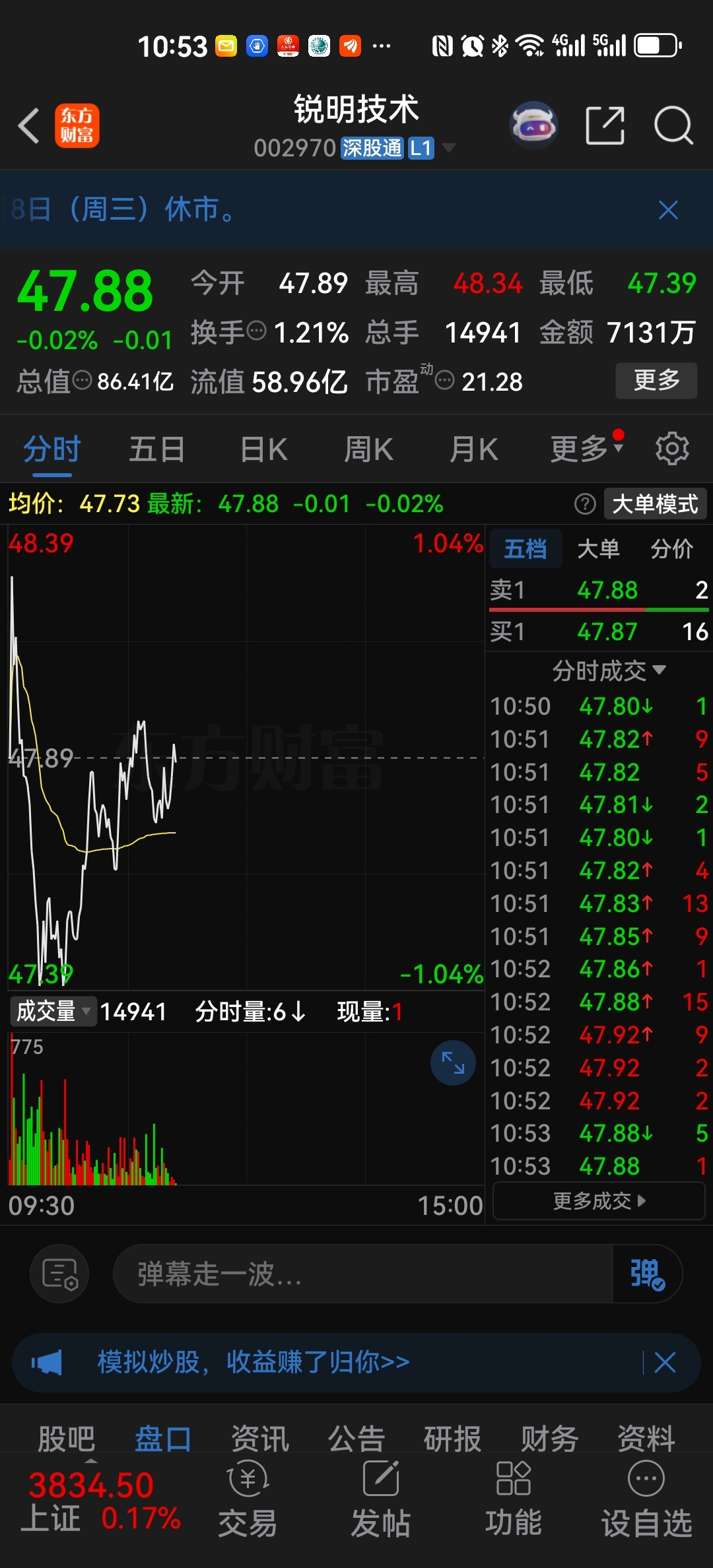 $锐明技术(SZ002970)$ 一分钟成交五笔,这还咋玩