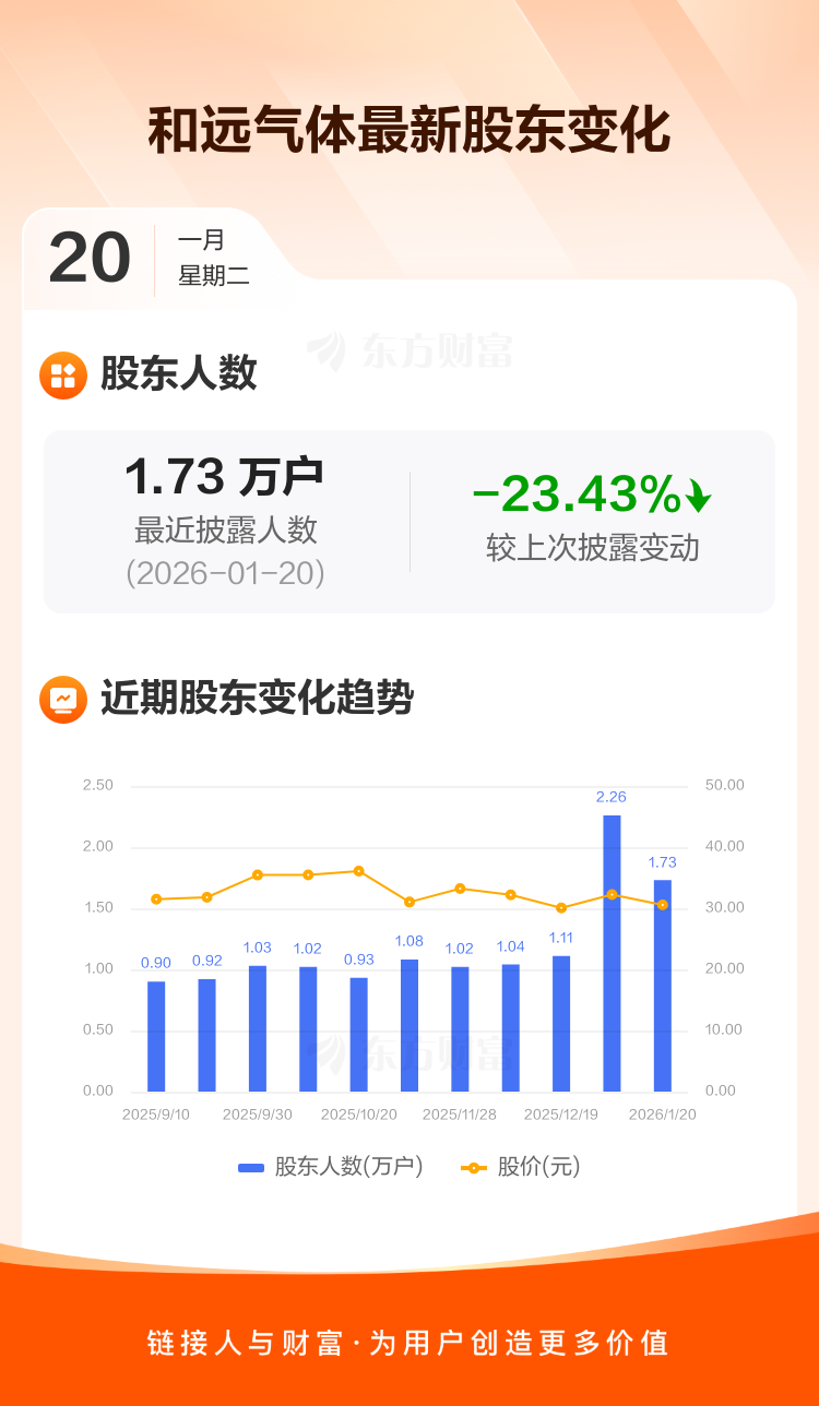 和远气体:截至1月20日最新股东户数1.73万户,较上期减少23.43%