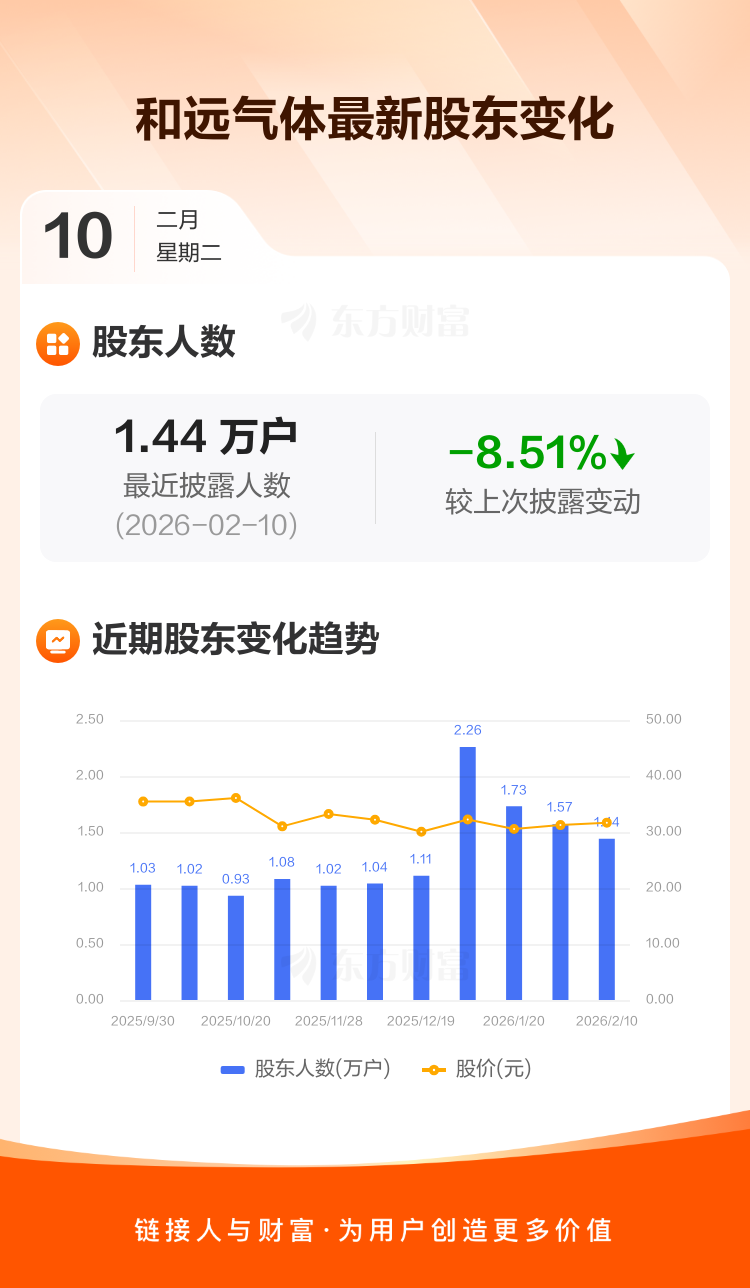 和远气体:截至2月10日最新股东户数1.44万户,较上期减少8.51%
