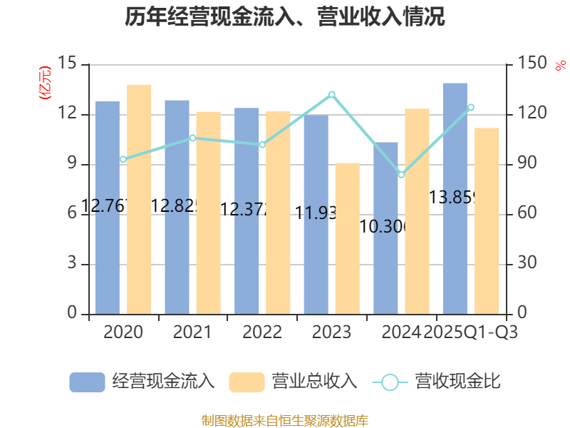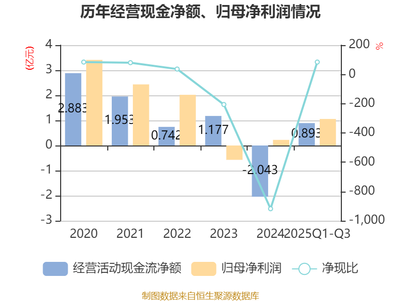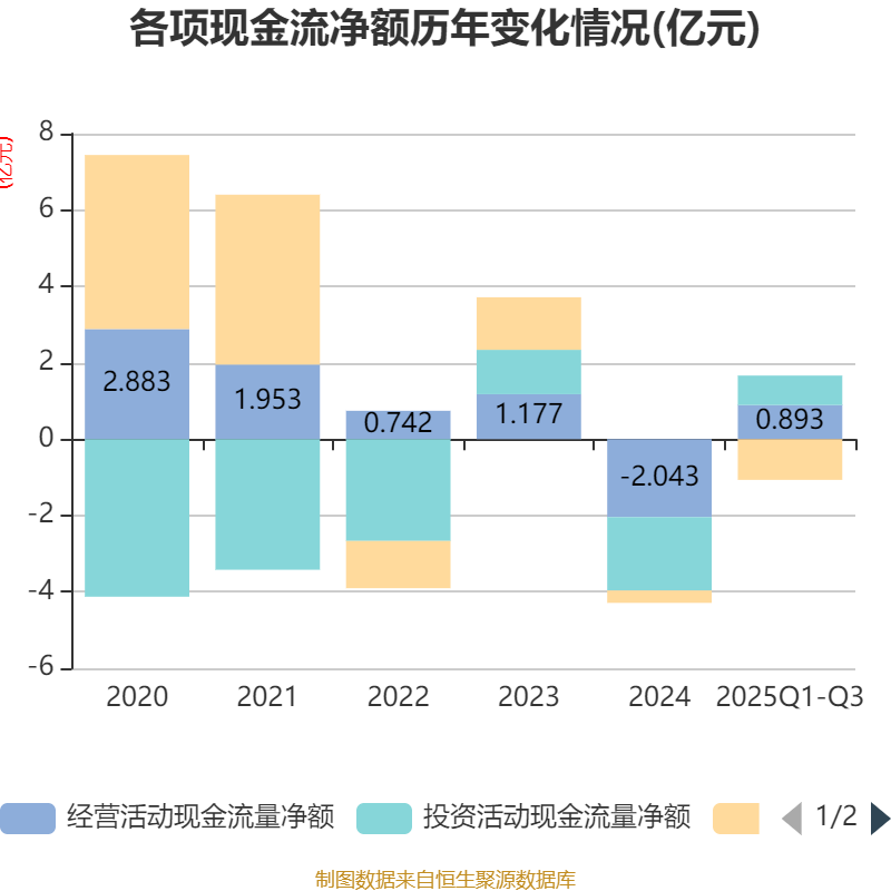 2025年前三季度,公司经营活动现金流净额为8930.61万元,同比增加2.99亿元;筹资活动现金流净额-1.07亿元,同比减少5203.97万元;投资活动现金流净额7718.26万元,上年同期为-7158.23万元。