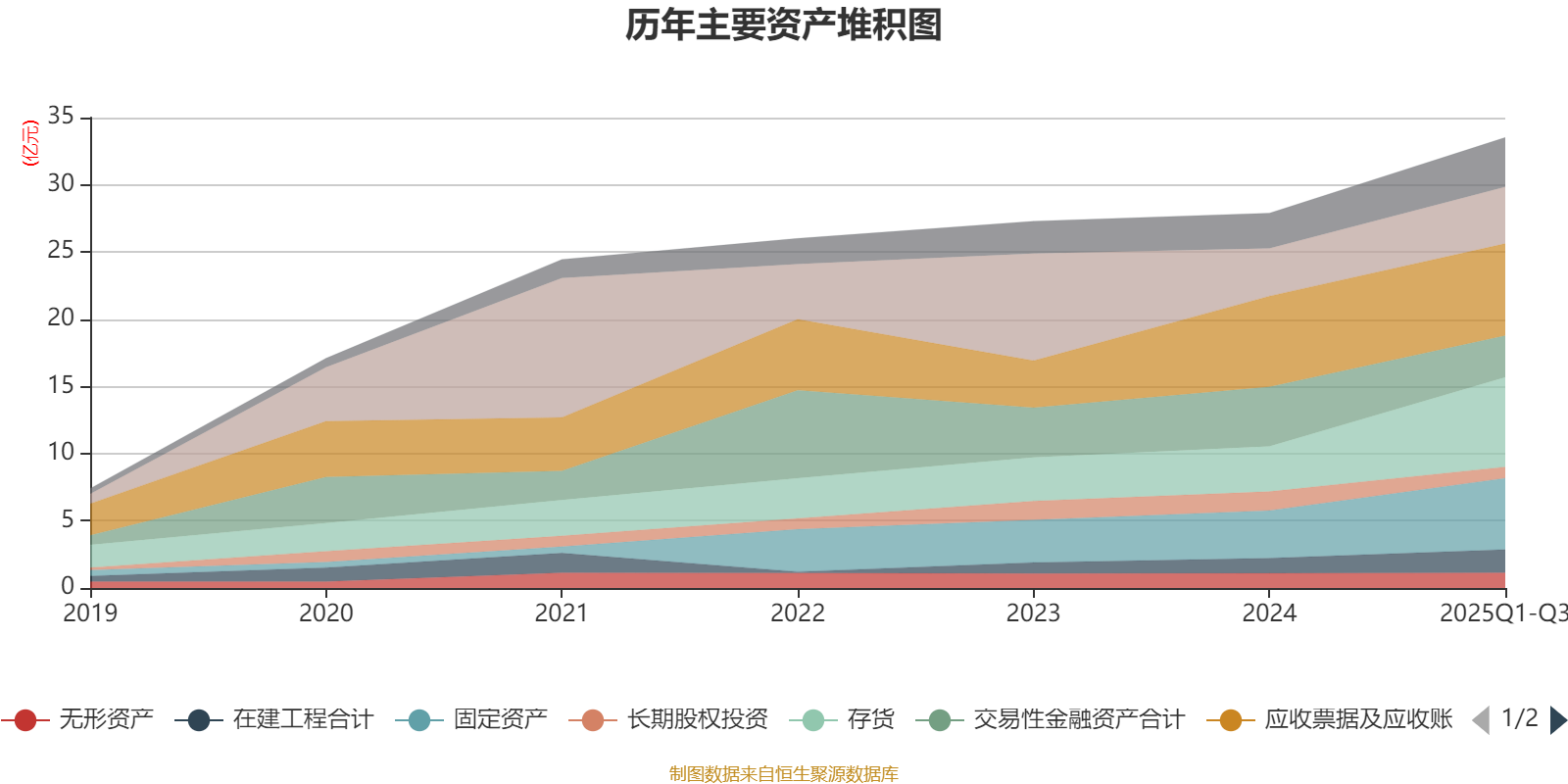 资产重大变化方面,截至2025年三季度末,公司存货较上年末增加98.39%,占公司总资产比重上升7.84个百分点;交易性金融资产合计较上年末减少29.97%,占公司总资产比重下降6.61个百分点;应收票据及应收账款较上年末增加1.36%,占公司总资产比重下降3.79个百分点;固定资产较上年末增加49.58%,占公司总资产比重上升3.12个百分点。