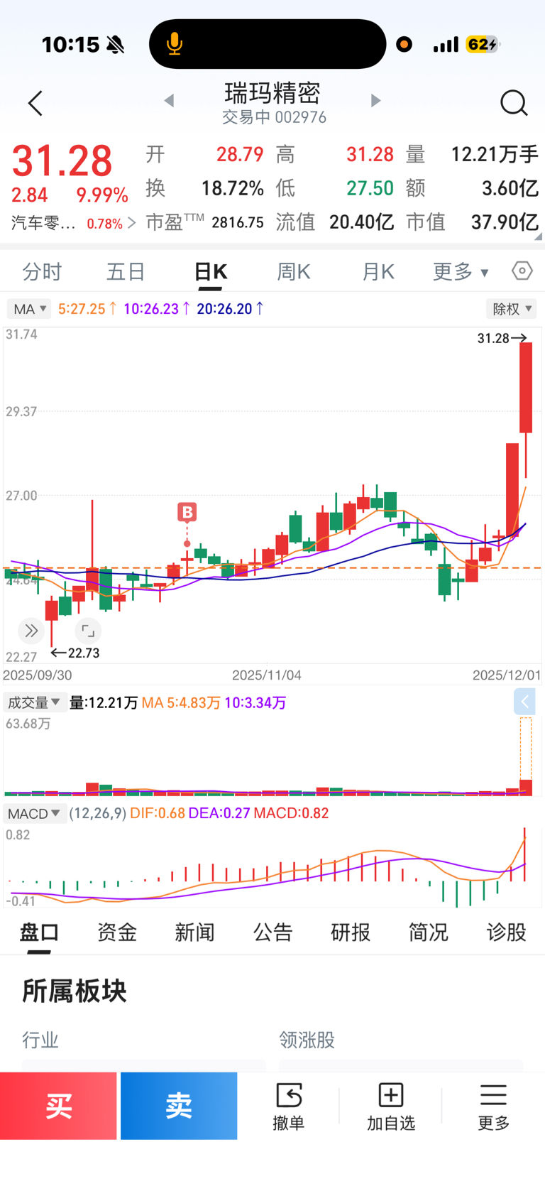 $瑞玛精密(SZ002976)$ 终于让我蹲到了,拿了一个月