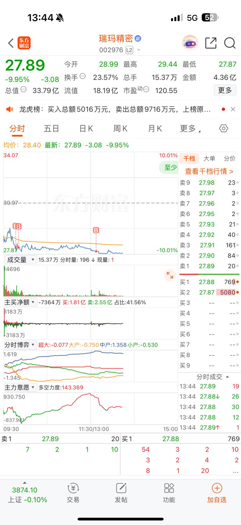 $瑞玛精密(SZ002976)$ 刚买就亏一个点,明天只要不跌停就跑,跌停战法好刺激