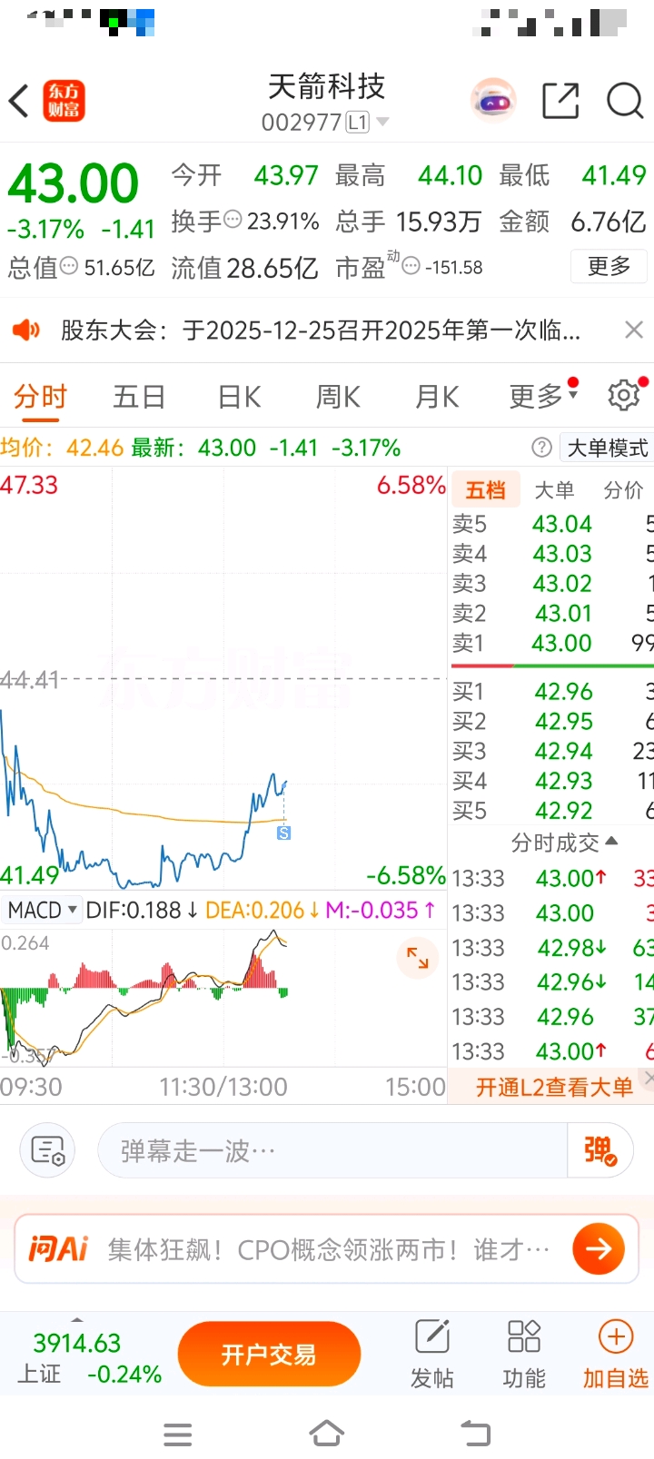 $天箭科技(SZ002977)$ 当断则断,不管接下来趋势如何不如择其他优股,今日大盘下跌,小亏不算亏了,虾仁也是割肉出来重新跟入其他票准备继续博弈