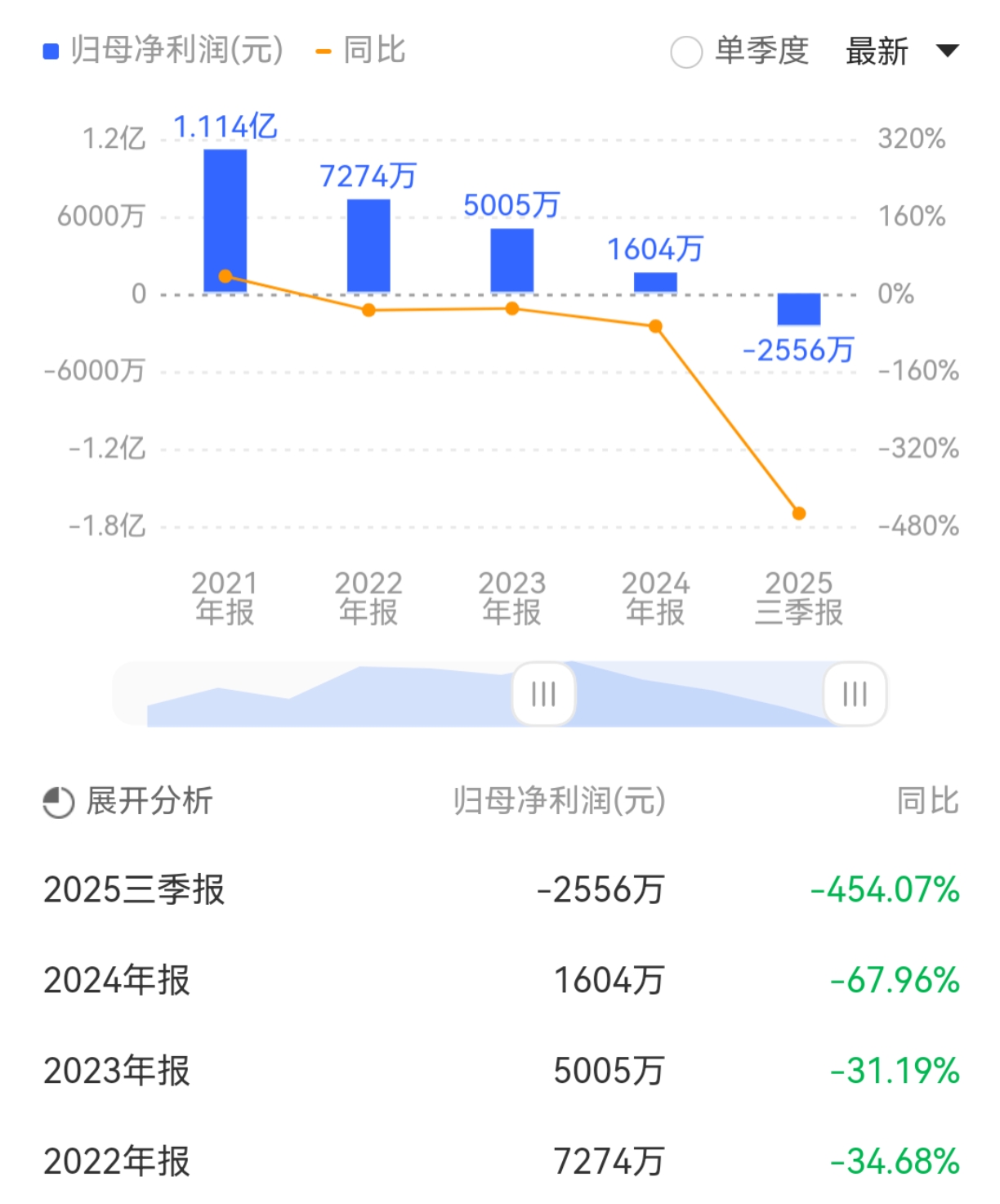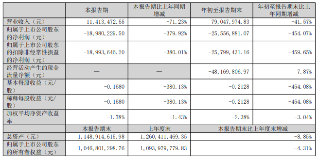 2025年前三季度,公司营业收入为7904.80万元,同比下降41.57%;归母净利润为-2555.69万元,同比下降454.07%;扣非归母净利润为-2579.94万元,同比下降459.65%。