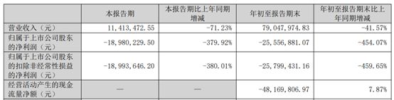 2025年前三季度,公司实现营收7904.80万元,同比下降41.57%;归母净利润为-2555.69万元,同比下降454.07%;扣非归母净利润为-2579.94万元,同比下降459.65%。