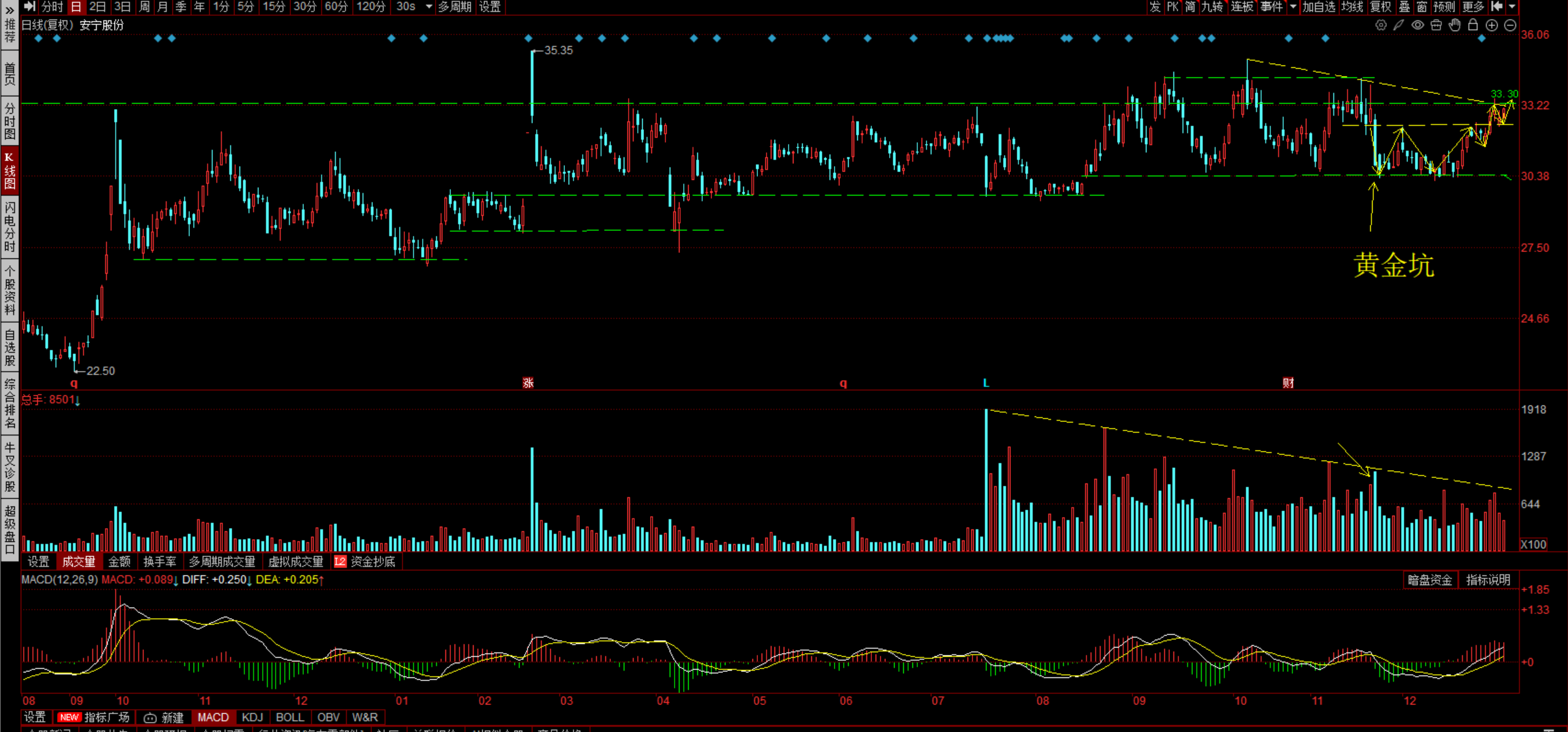 安宁股份:黄金坑+上轨下方蓄势,准备突破