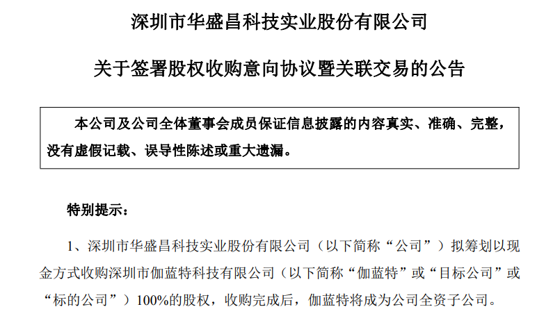 公告显示,华盛昌已与伽蓝特股东余新文、张松伟、林小龙、史开贵签署《股权收购意向协议》,拟以现金收购伽蓝特100%股权;此外,华盛昌控股股东、实际控制人袁剑敏与伽蓝特创始股东余新文签署《股份转让协议》,约定袁剑敏通过协议转让方式向余新文转让所持华盛昌5%的股份(947.01万股),转让以股权收购完成为前提。