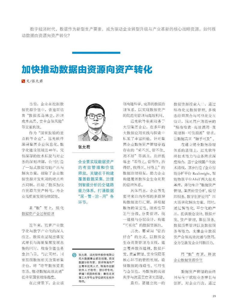 作为“国家鼓励的重点软件企业”,远光软件深耕集团企业信息化、数字化建设领域近40 年,凭借深厚的技术积淀与对业务的深刻理解,公司打造了一站式数据智能产品与解决方案,破除了企业数据资源开发利用的堵点难点问题,推动了数据加快由资源向资产转化,为企业高质量发展持续赋能。